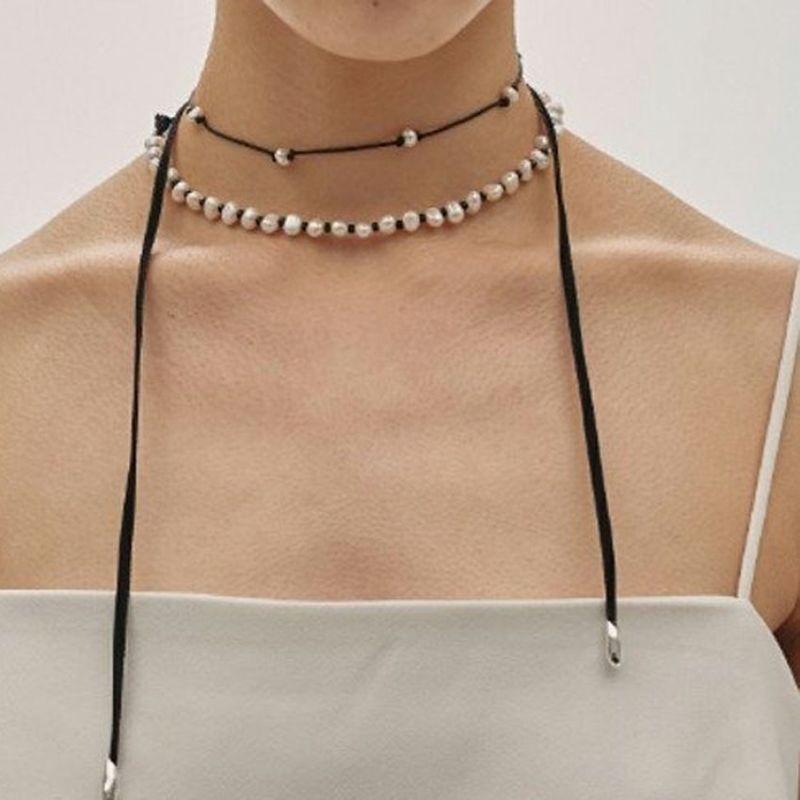 淡水パールとベロア生地のリボンを使用したチョーカー。