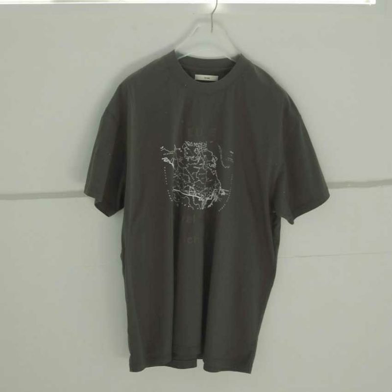 繊細なラインのマップ柄がスタイリングのポイントになるプリントTシャツ。