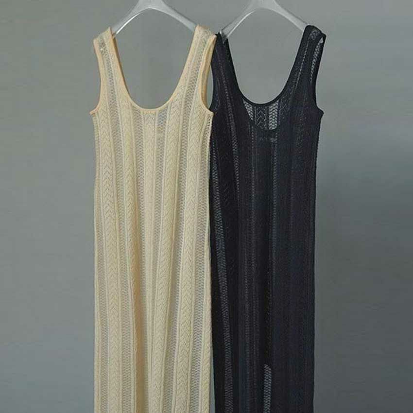 ふんわりと起毛したモヘア混の糸と細番手のシアー感のある糸をミックスさせた透かし編みのニットワンピース。