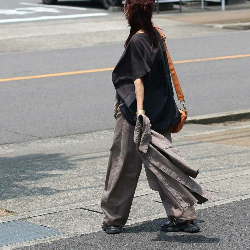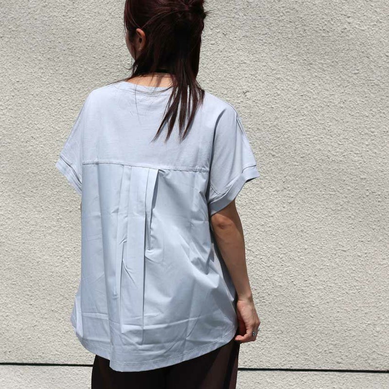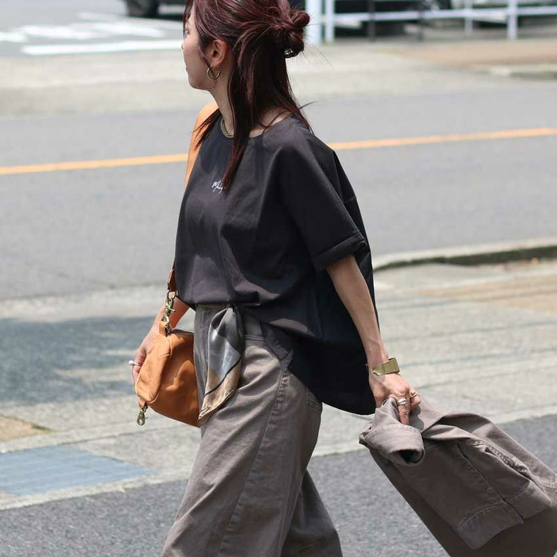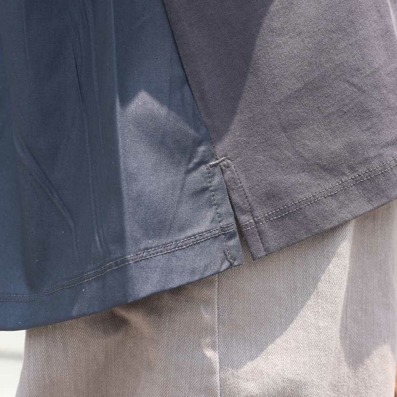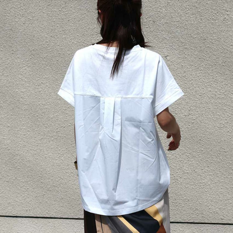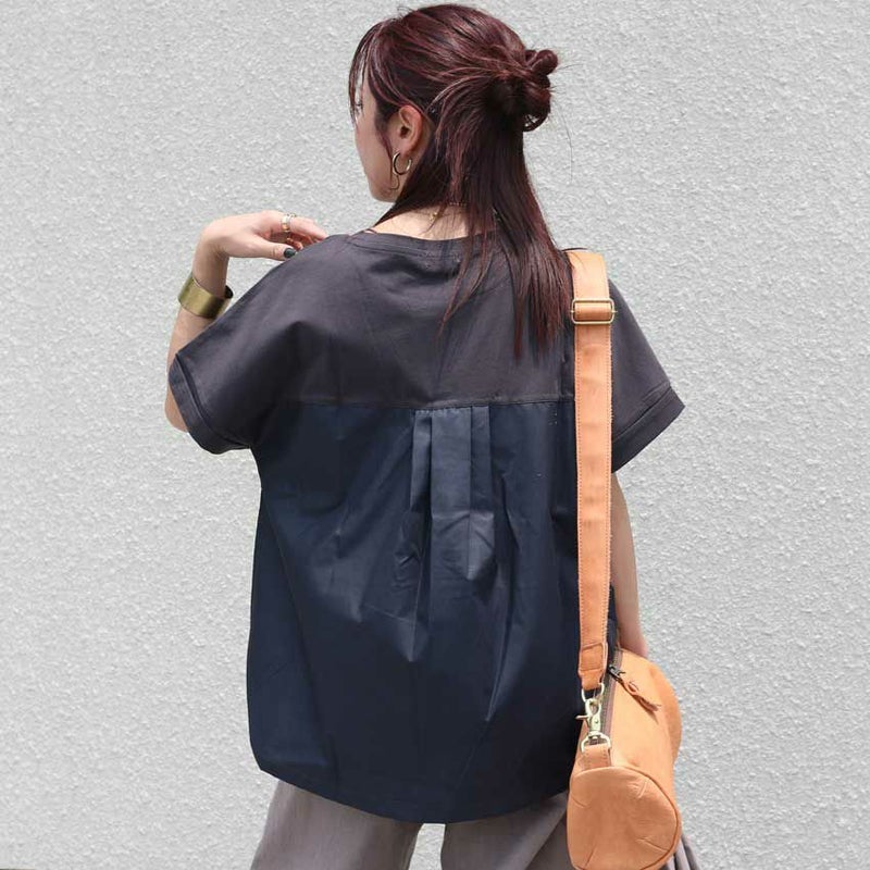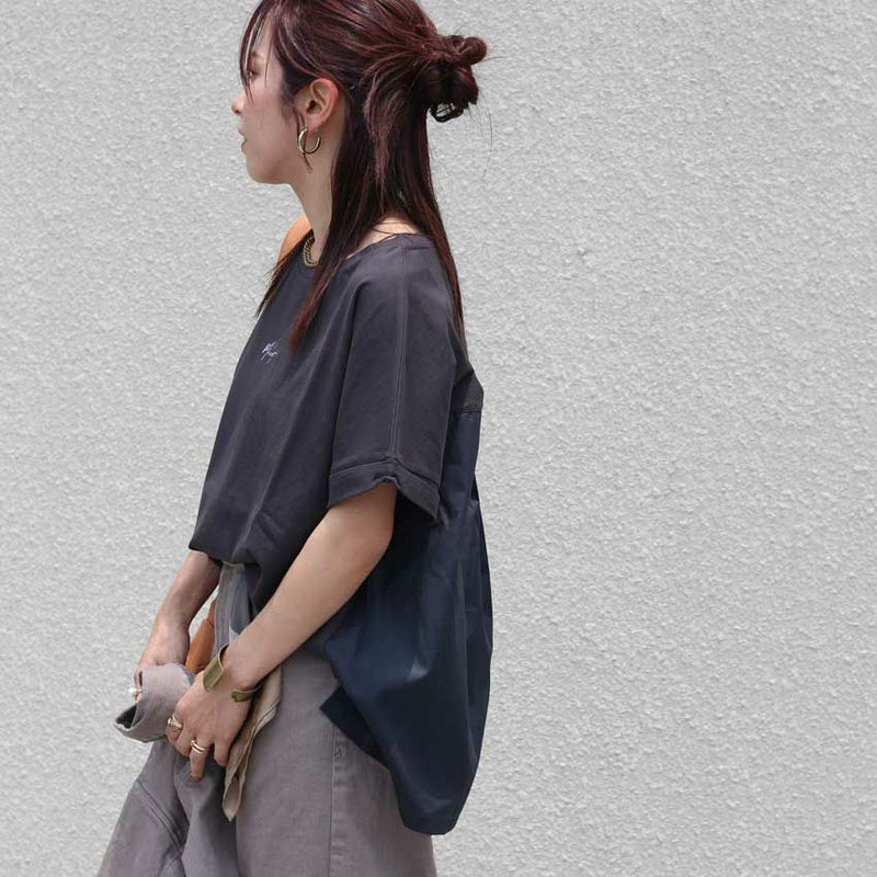フロント部分とバックの素材を変えてデザイン性を持たせつつシルエットにもこだわりオーバー過ぎないすっきり目なシルエットに仕立てられた大人なデザインTシャツです。