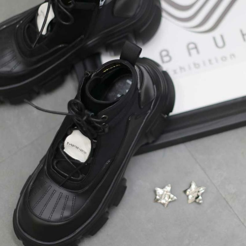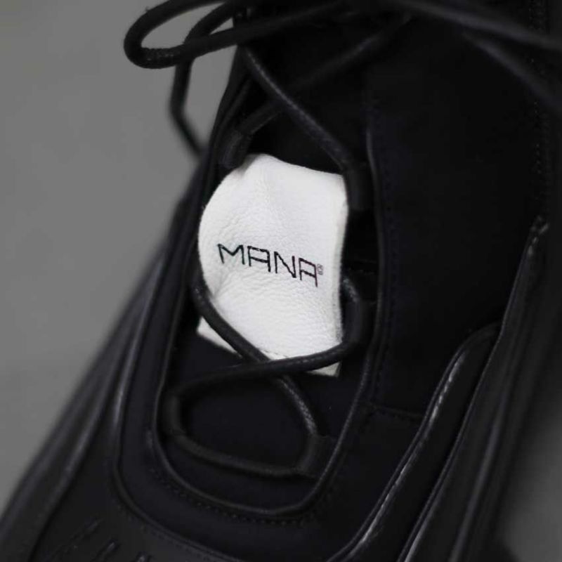 編み上げのシューレースの隙間から覗く、MANAのブランドワッペンが、足元にさりげないアクセントをプラス。
