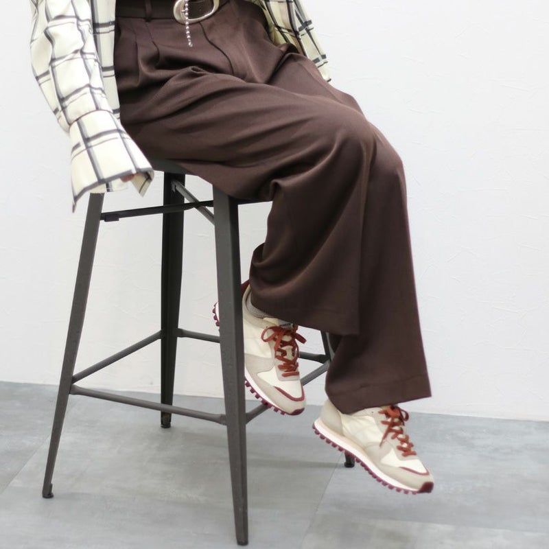 シューレースはオフホワイトとボルドーの2色使いをしており、気分やスタイリングに応じて変化を付けられるのも嬉しいポイントです。