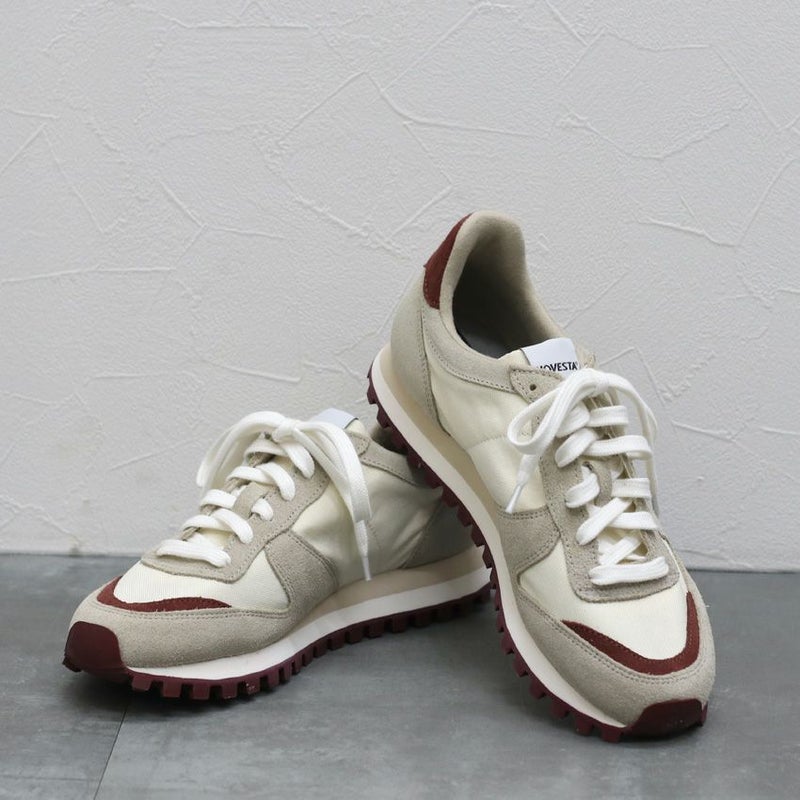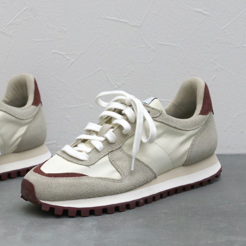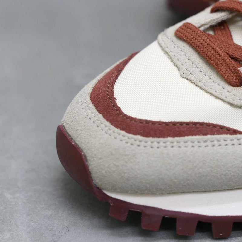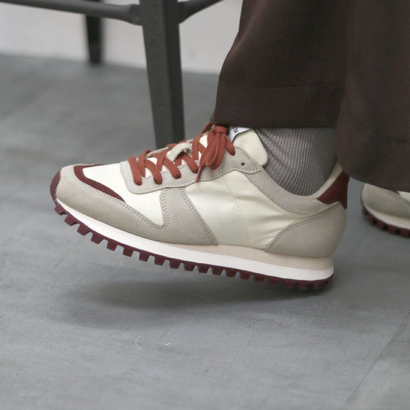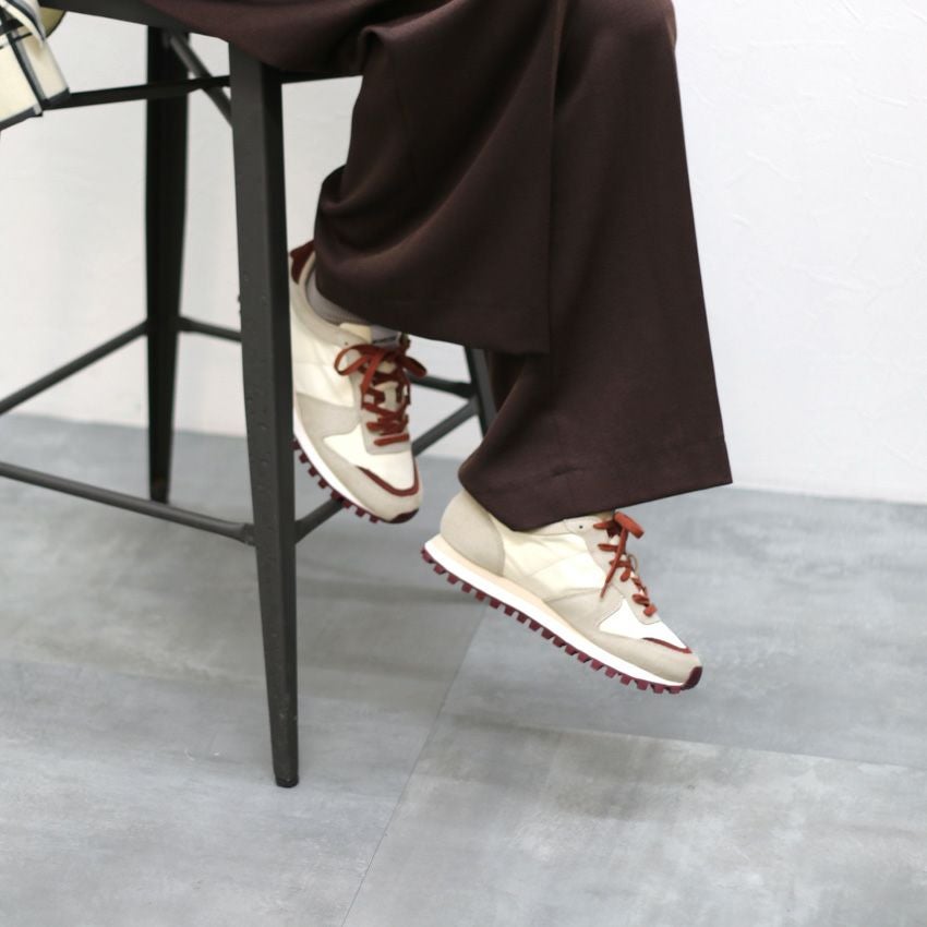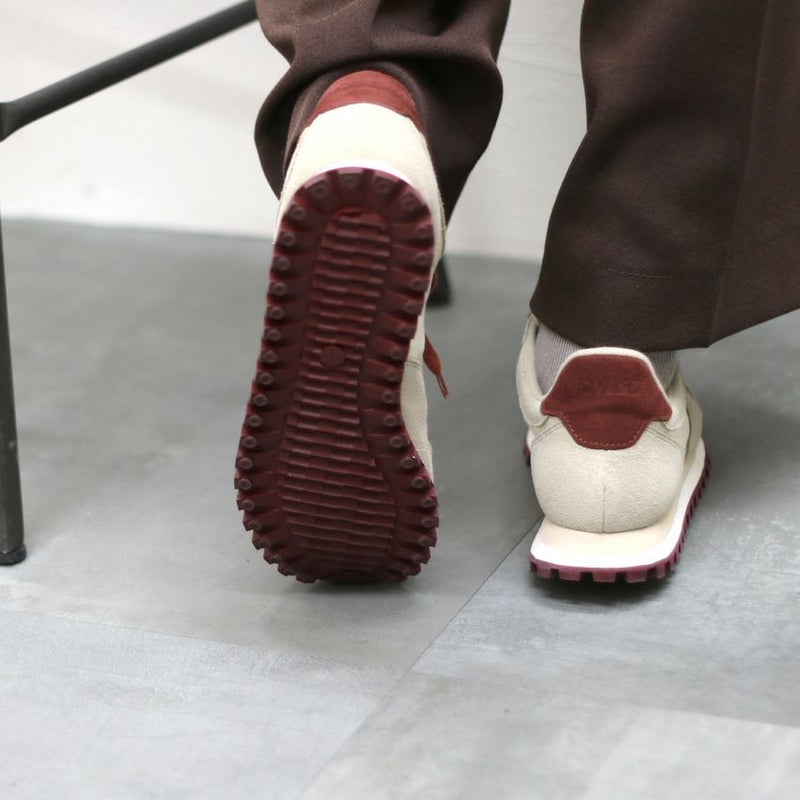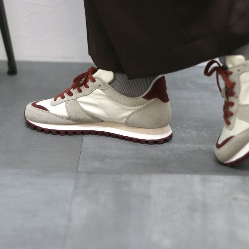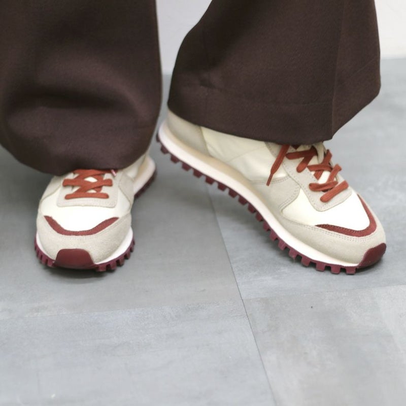 アイボリーとグレーをベースにボルドーをアクセントにミックスした配色は、トレンド感のある“レトロさ”をしっかりと感じさせる高い感度をもつ大人な1足となっています。