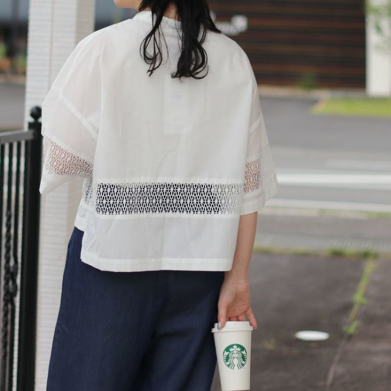 きちんと感のあるクルーネックに、控えめながら華やかさを添えるレースの透け感。