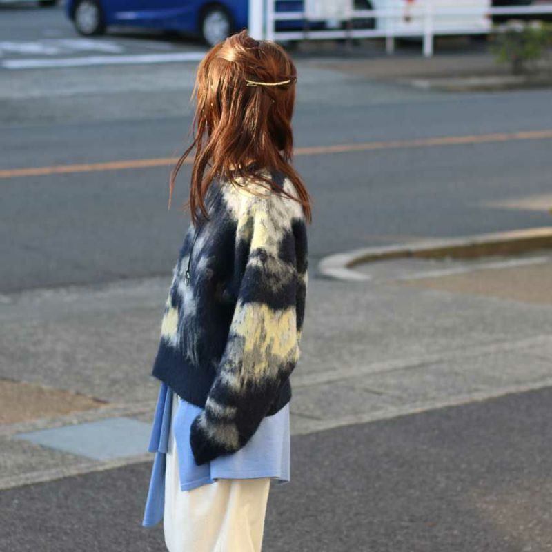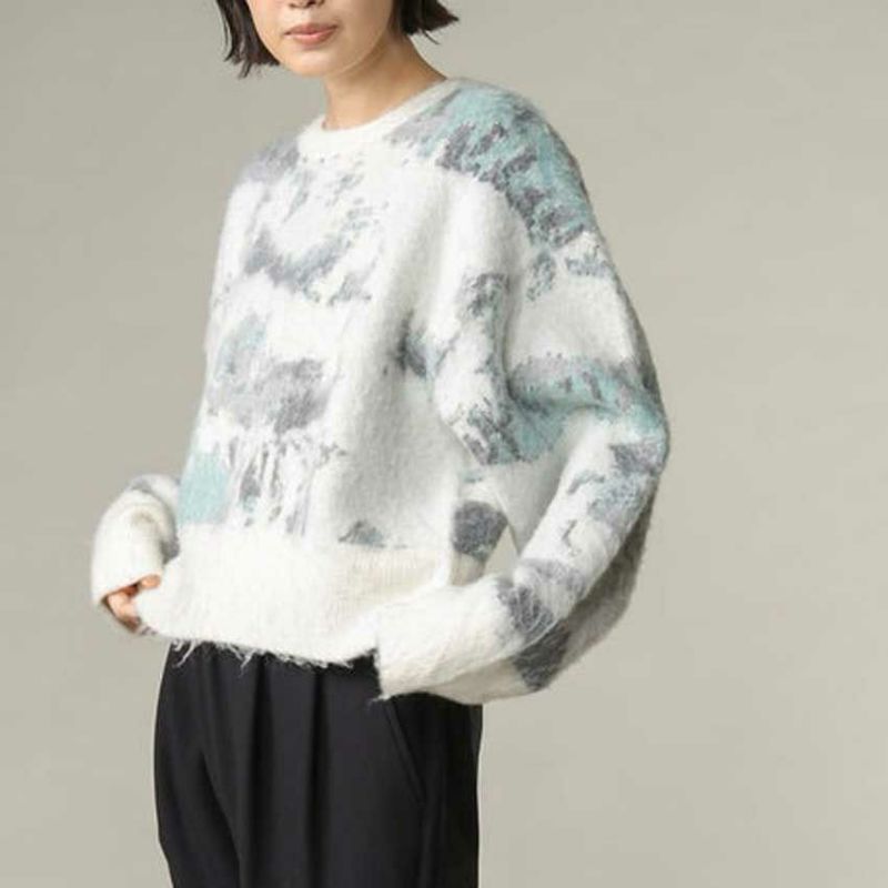 長めの毛足がふわっと揺れる、ニュアンス柄のシャギープルオーバーニット。