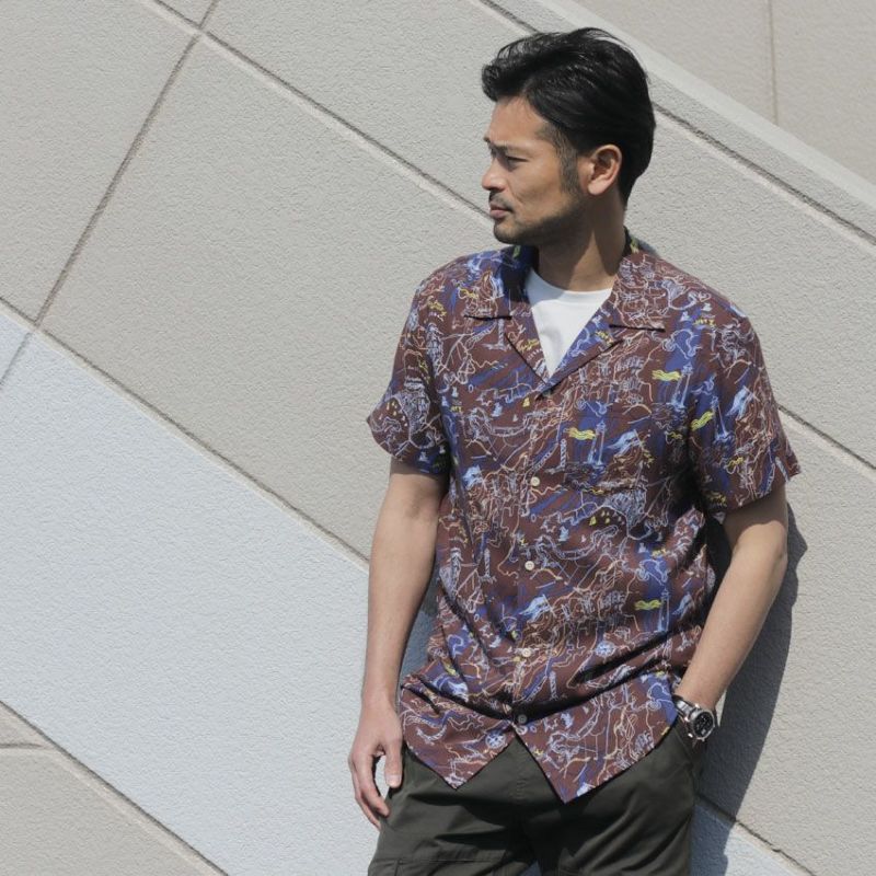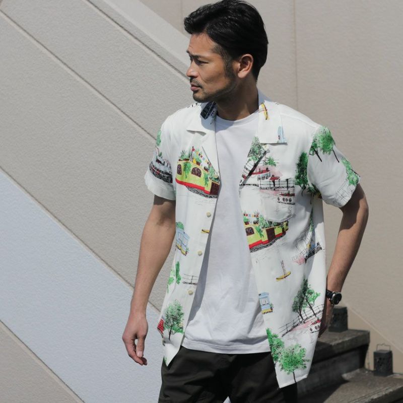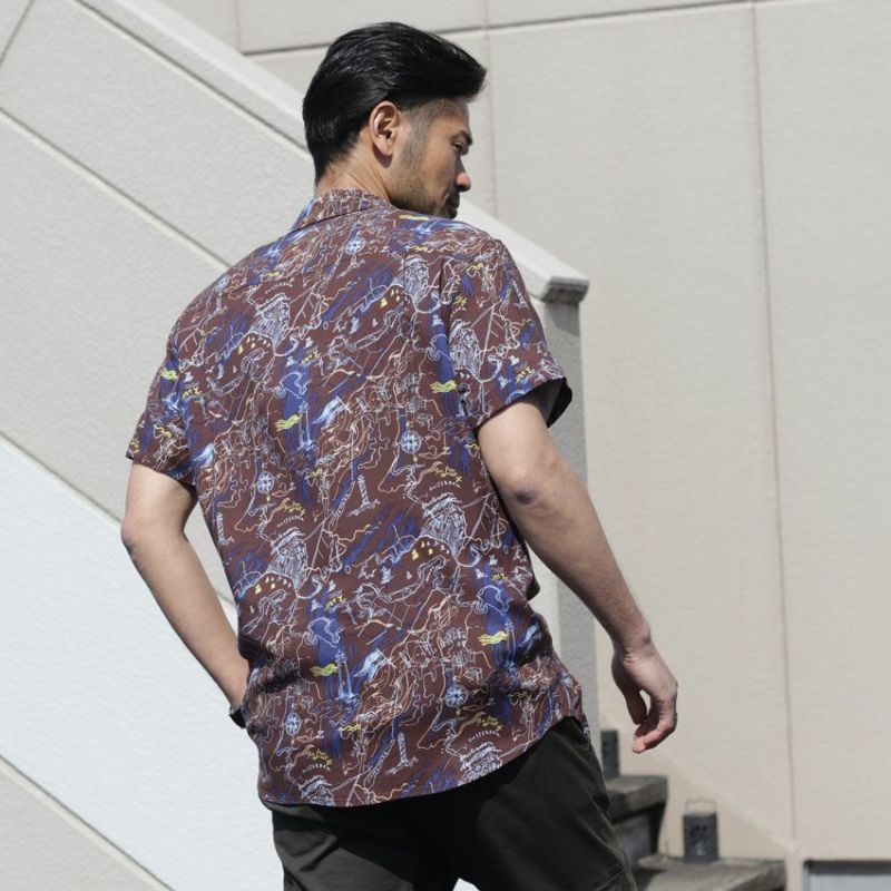 ホワイトベースのシャツには、カラフルな街並みや船の柄をプリントし、ブラウンベースのシャツには、走り書きのような地図や、鉄塔がプリントされています。