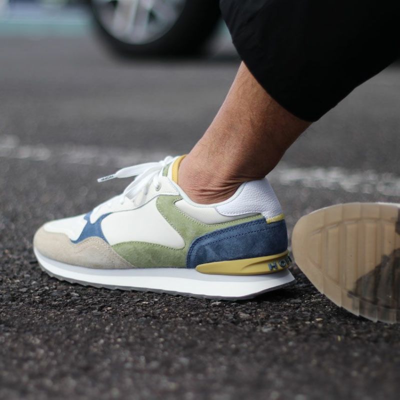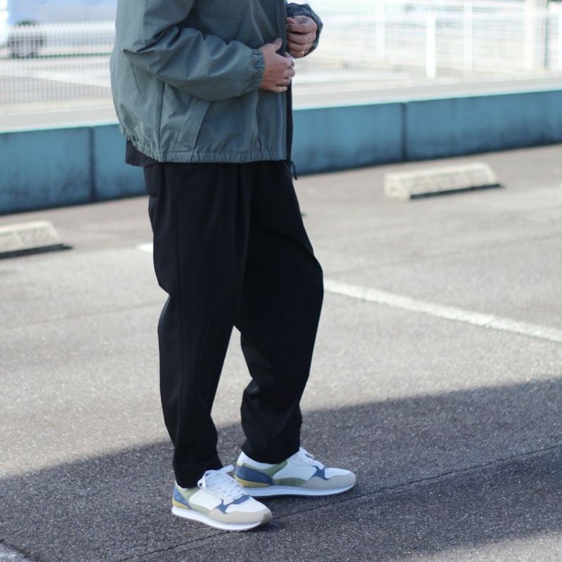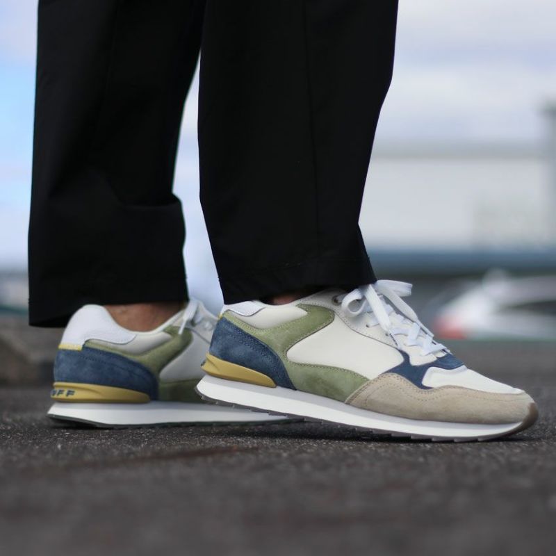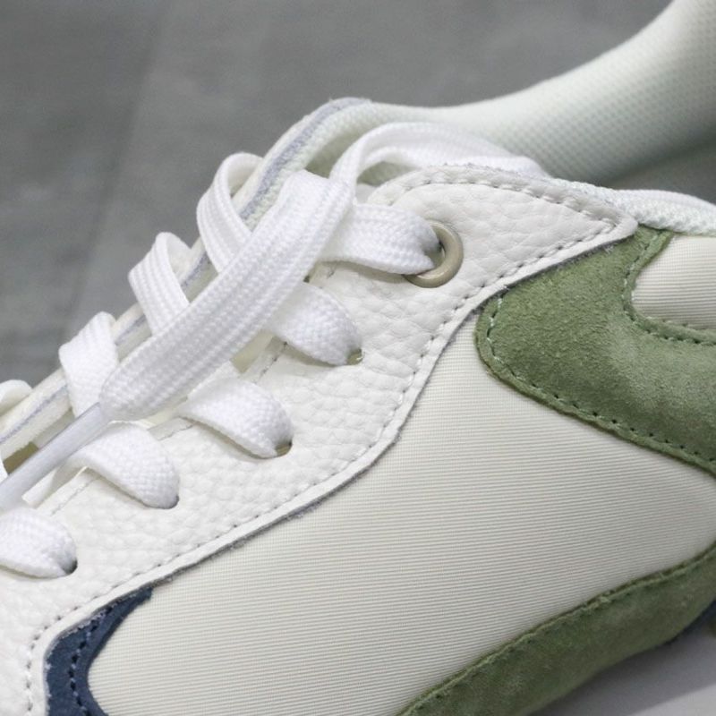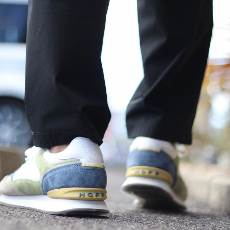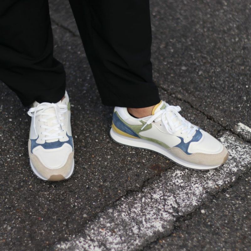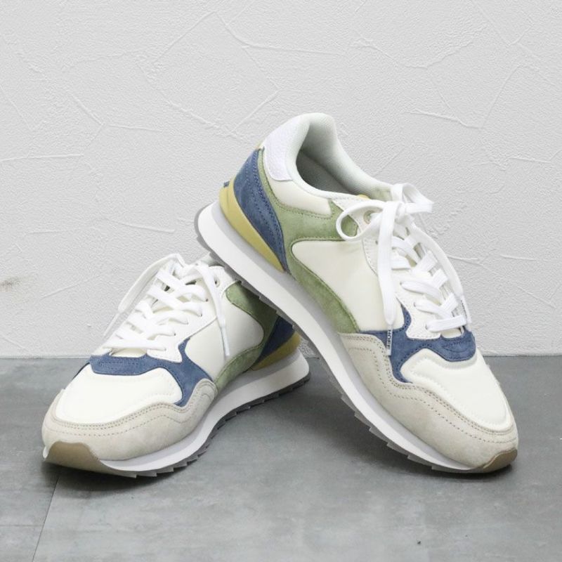 ベージュベースに、ブルーやグリーン、イエローのくすみカラーをコンビした大人スニーカーに仕上がりました。