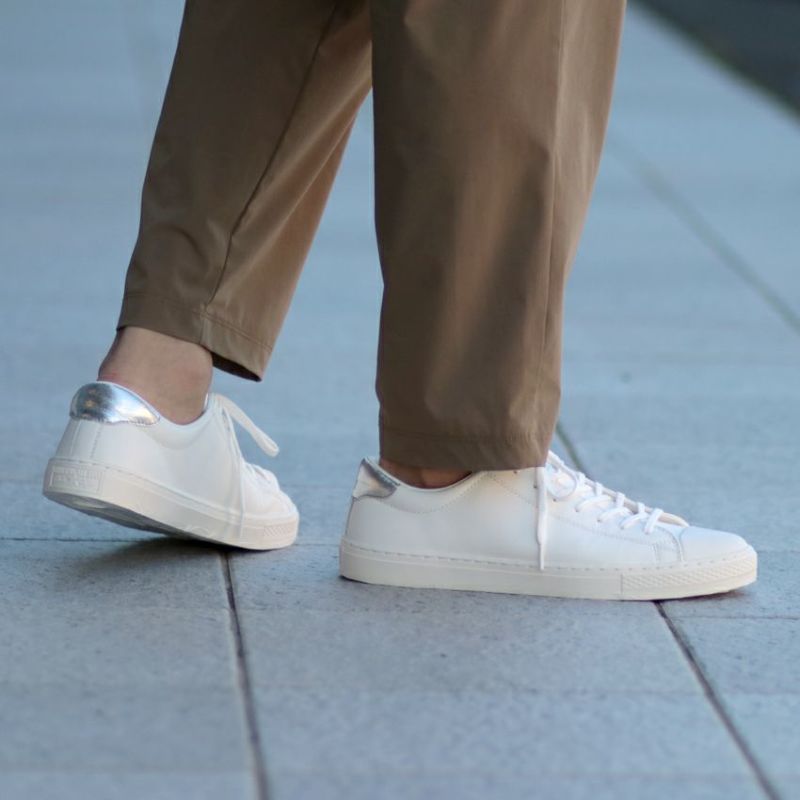 高級感ある純白のレザーが、スニーカーのイメージを覆すようなキレイめな一足に。