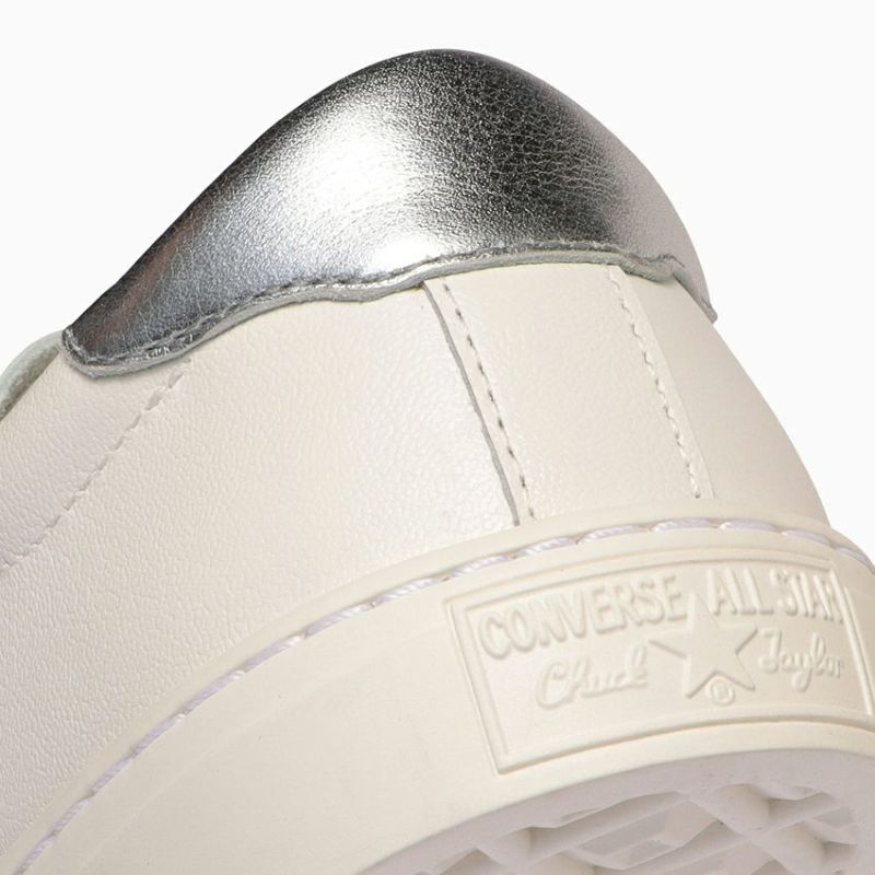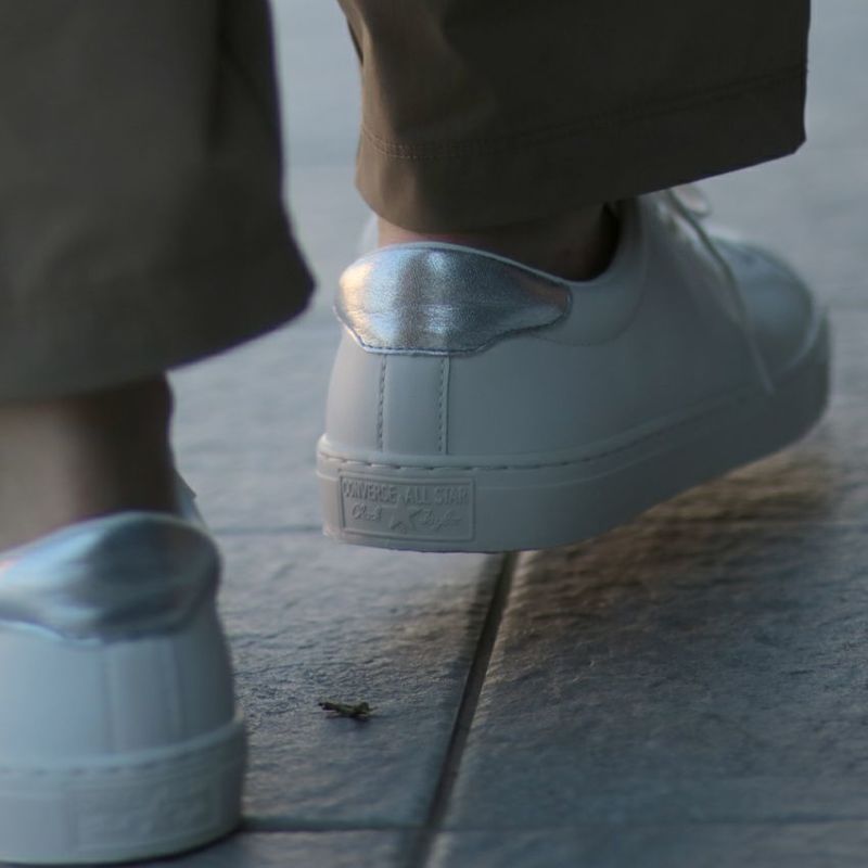シンプルなホワイトアッパーに、シルバーのグレインレザーをタンとバックチップにポイント使いしたアイテム。