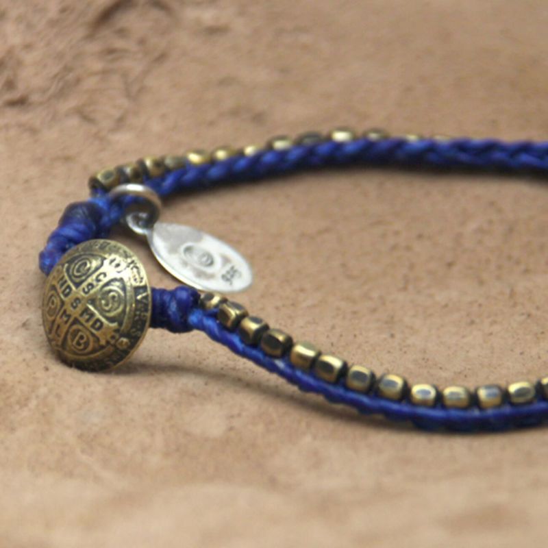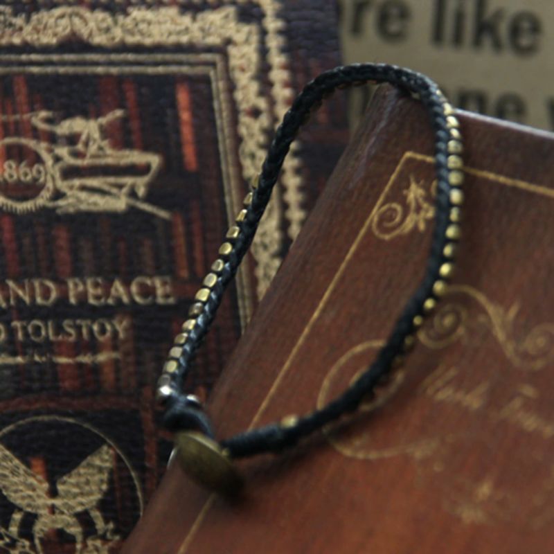 蝋引きした硬めのワックスコードに手作業で真鍮を1つずつ縫い込んだハンドメイドアクセサリーです