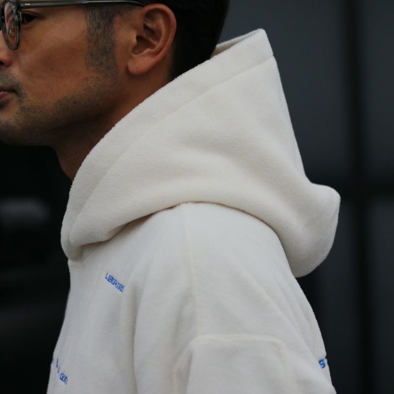 立体裁断×刺繍ディテールの洗練されたフリースプルオーバーフーディ。