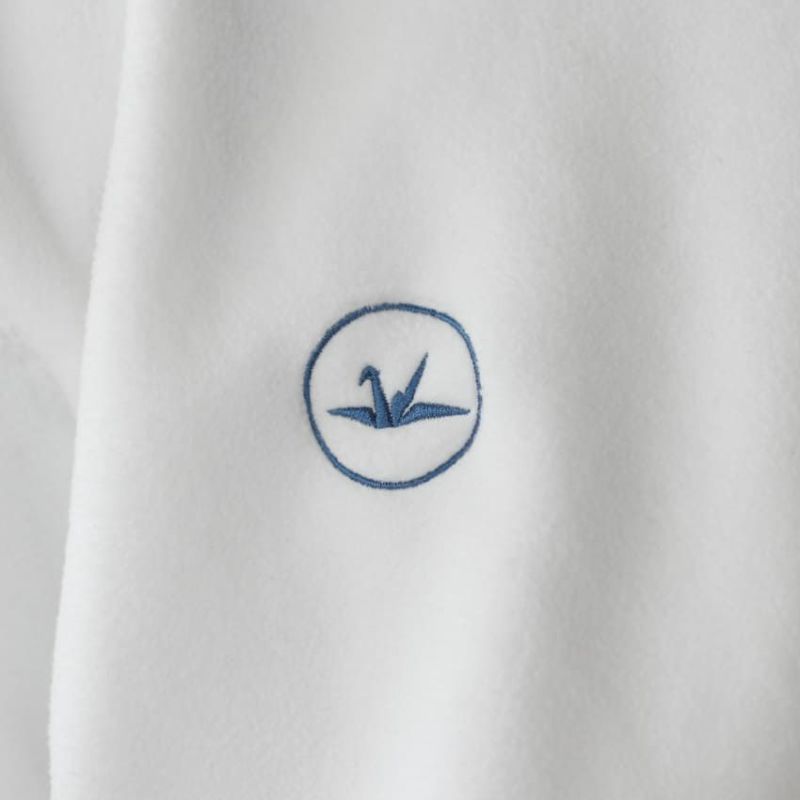 両胸に刺繍、腹部のポケット脇にはブルーラベルを配置、アクセントになっています。
