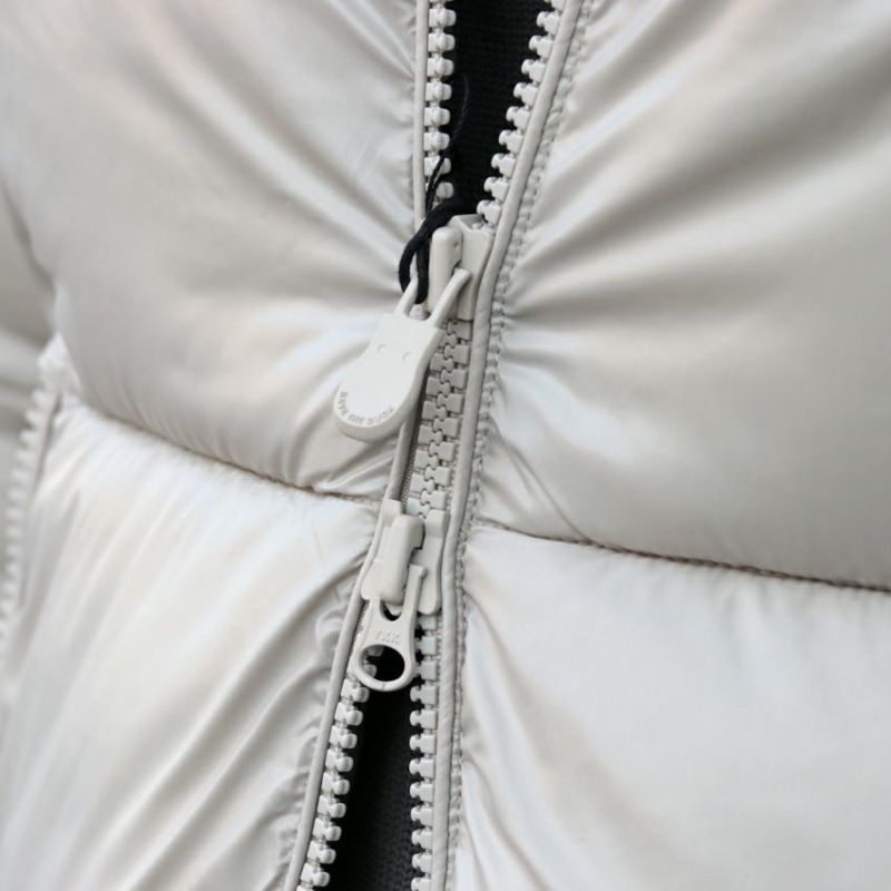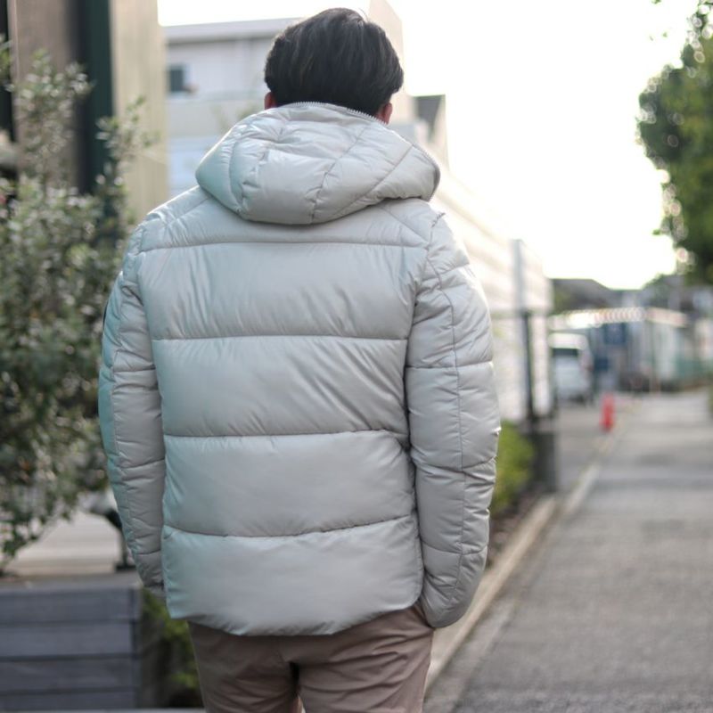 また、左袖にはマットラバー素材のブランドロゴを配置。シャイニーナイロン素材とマットラバーの組み合わせがとても高級感のある仕上がりです。非常に軽量でコンパクトな着心地と、高密度構造による優れた防風性能で、真冬でも暖かにお過ごし頂けます。