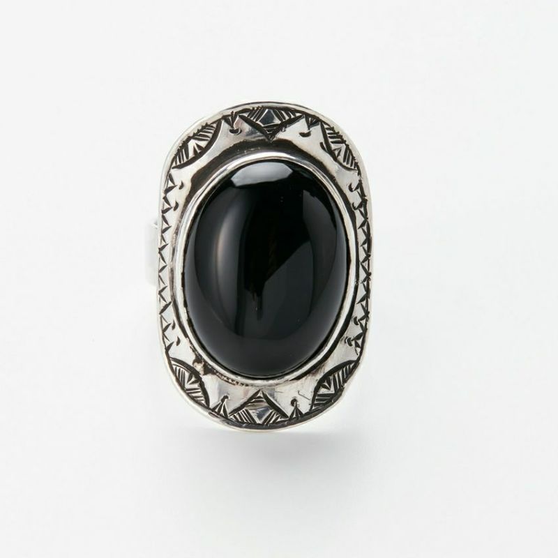 大粒のオニキスと細かに彫られた文様のコンビネーションが美しく、存在感あるデザインは、様々なコーディネートのアクセントとしてご使用頂けます。