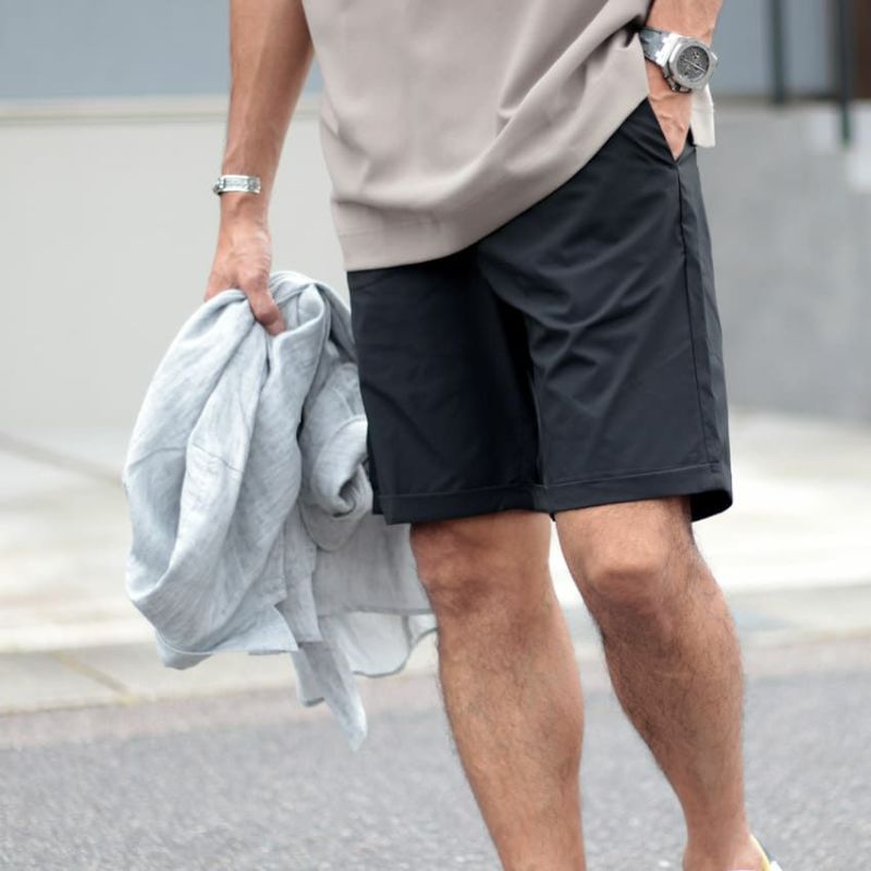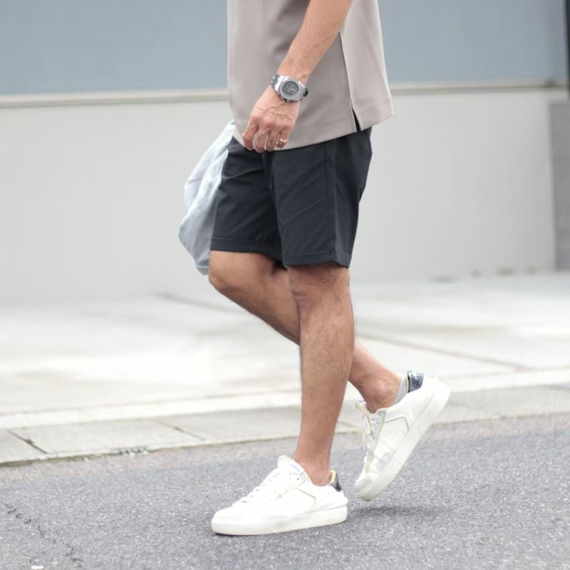 スラックスをベースとした大人らしい短パンのスタイルです。