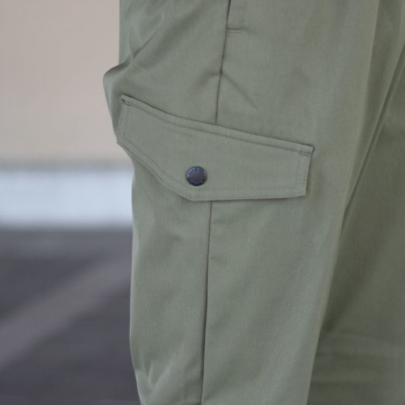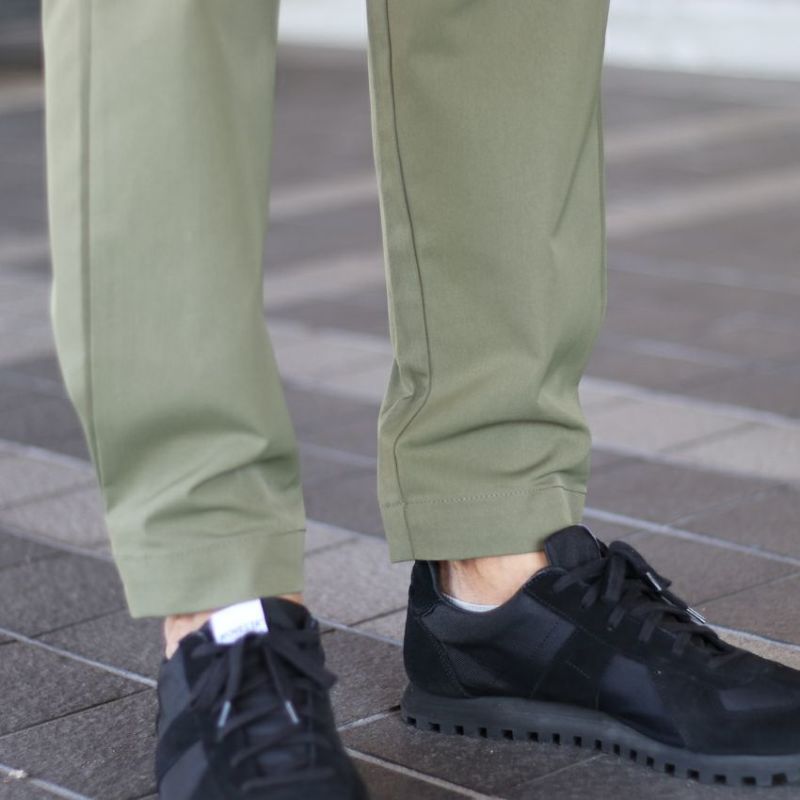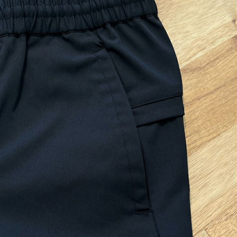 ポリ素材でありながら生地の見た目はコットン素材のチノパンのような生地。