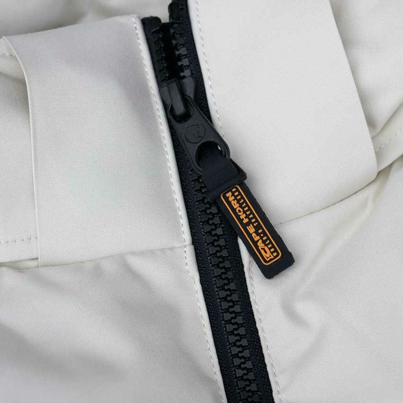 フロントジップ裏の同色ロゴや蛍光イエローのドローコードの配色など、随所にこだわりが感じられるさりげないディテール。