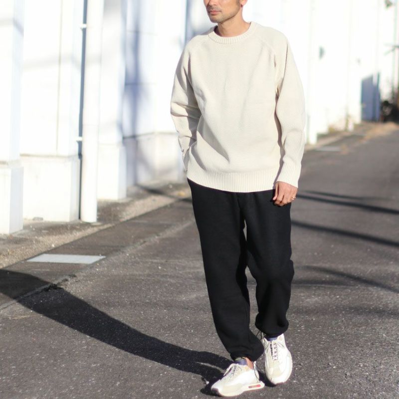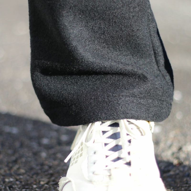 見た目にも暖かなウール、モコモコとした表情がありながらも厚すぎず、着膨れしにくくゆったりとしたテーパードシルエットとなります。