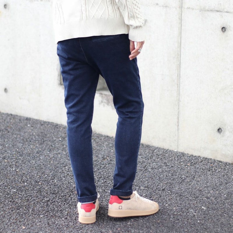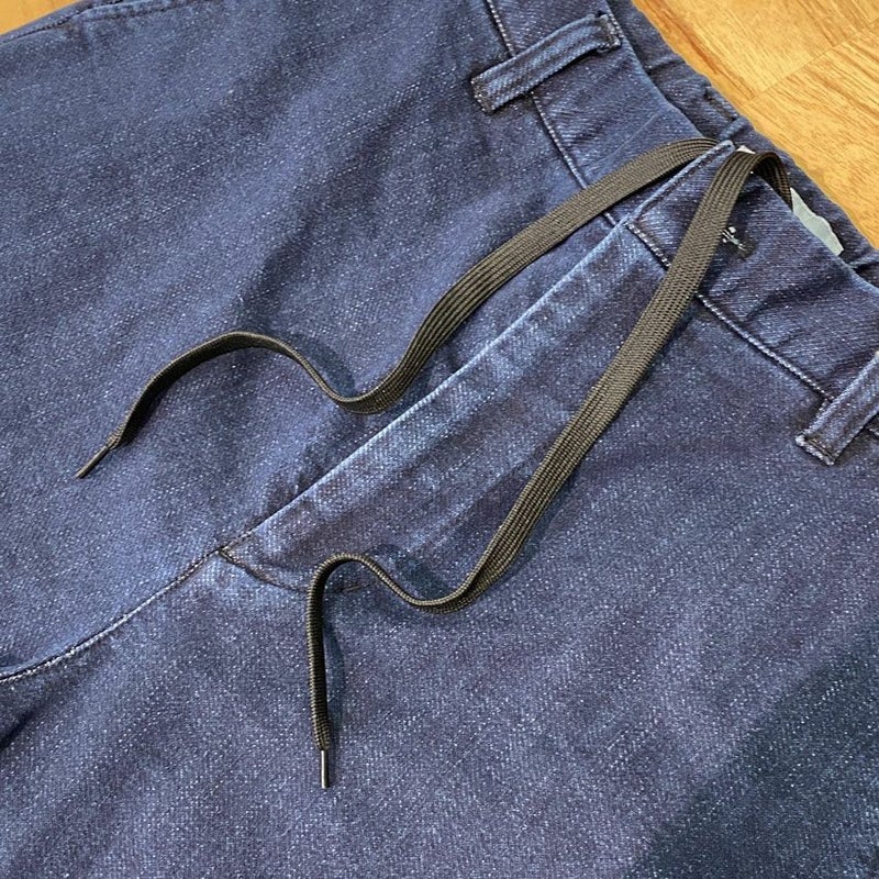 ウェストの後半分はゴム使用にし履き心地を重視、内側にはドローコードを入れベルトが要らないイージーパンツ使用です。