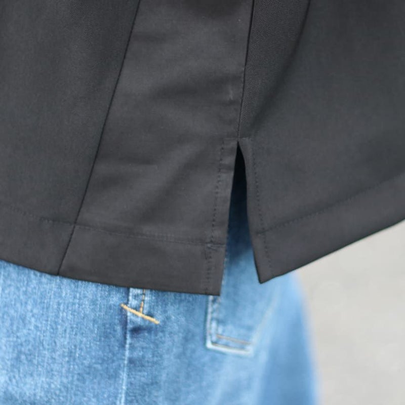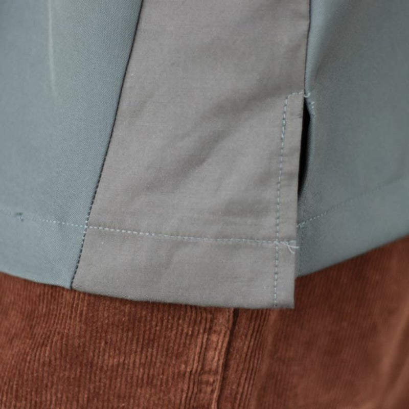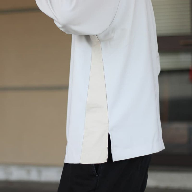 両サイドに、脇下から裾に向かって同色布帛で切り替えにしており、どの角度から見ても様になります。