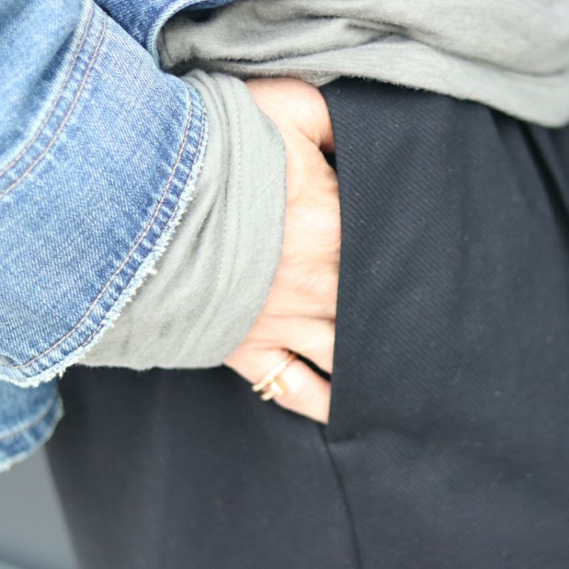 トップスを選ばず幅広く合わせやすく、ロンTやオーバーシャツ、スウェットとのコーディネートも自在。