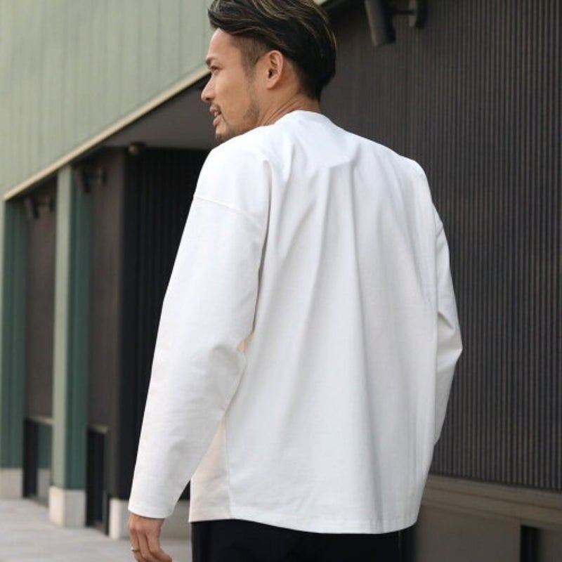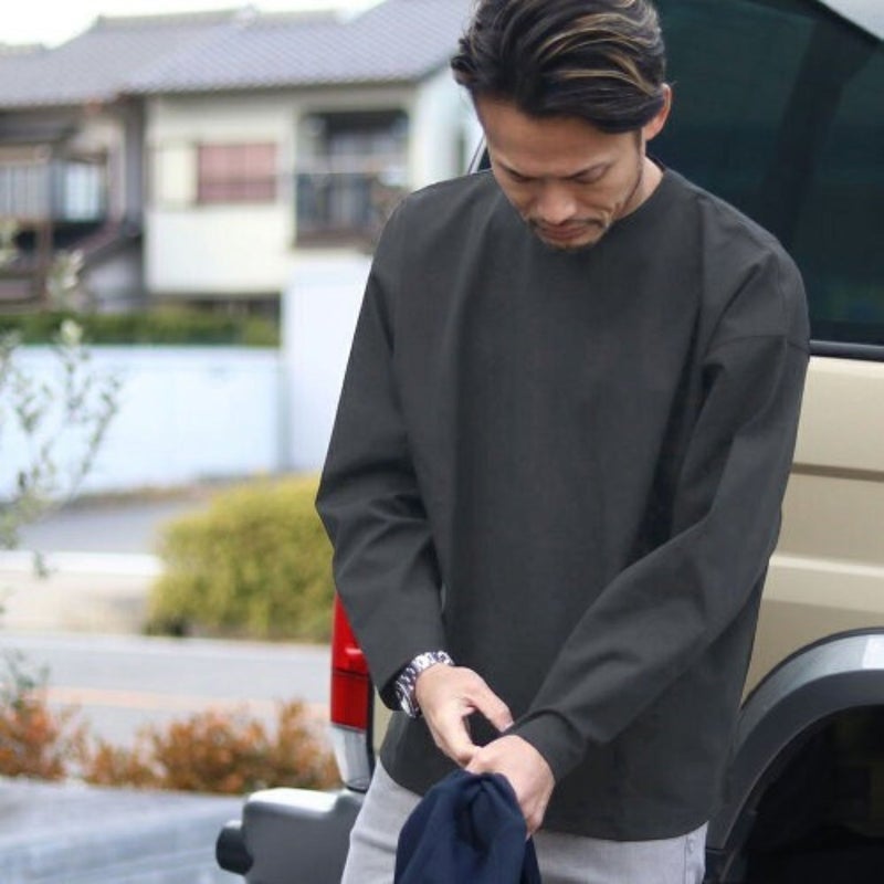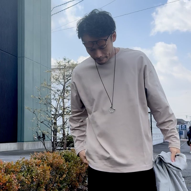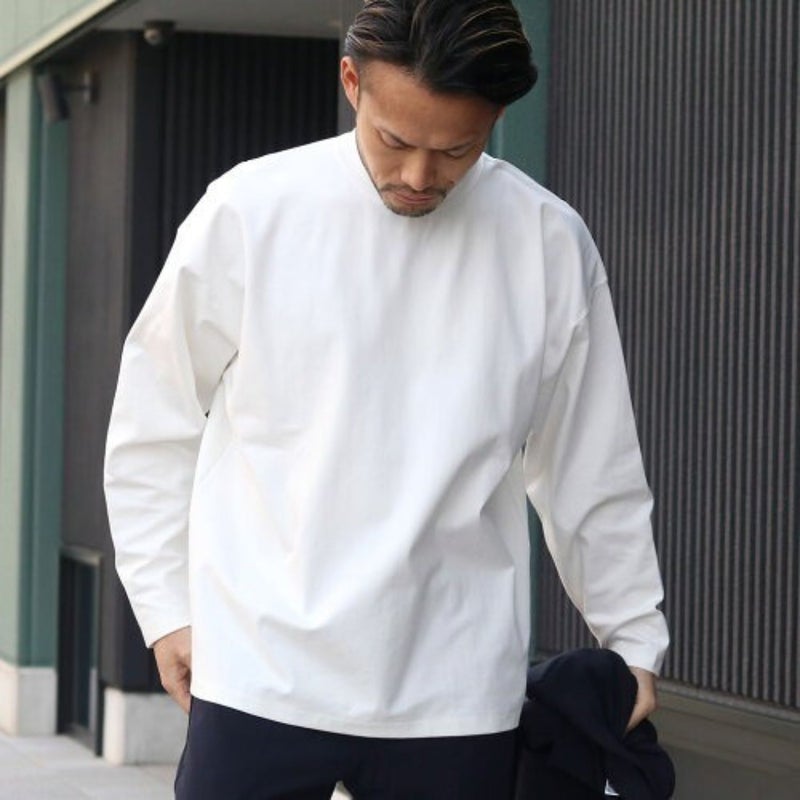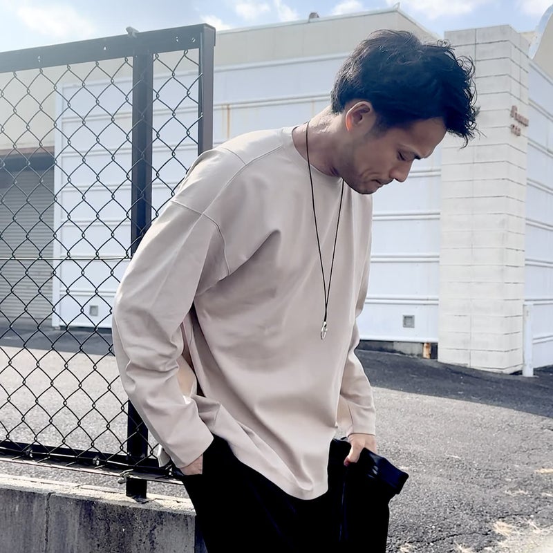 ドロップショルダーのややユルいシルエットながら、身幅を抑えて上からアウターを重ね着しやすいシルエットに仕上げています。前後で長さの異なる裾にデザインされ、無地カットソーでありながら「違い」のある一着です。