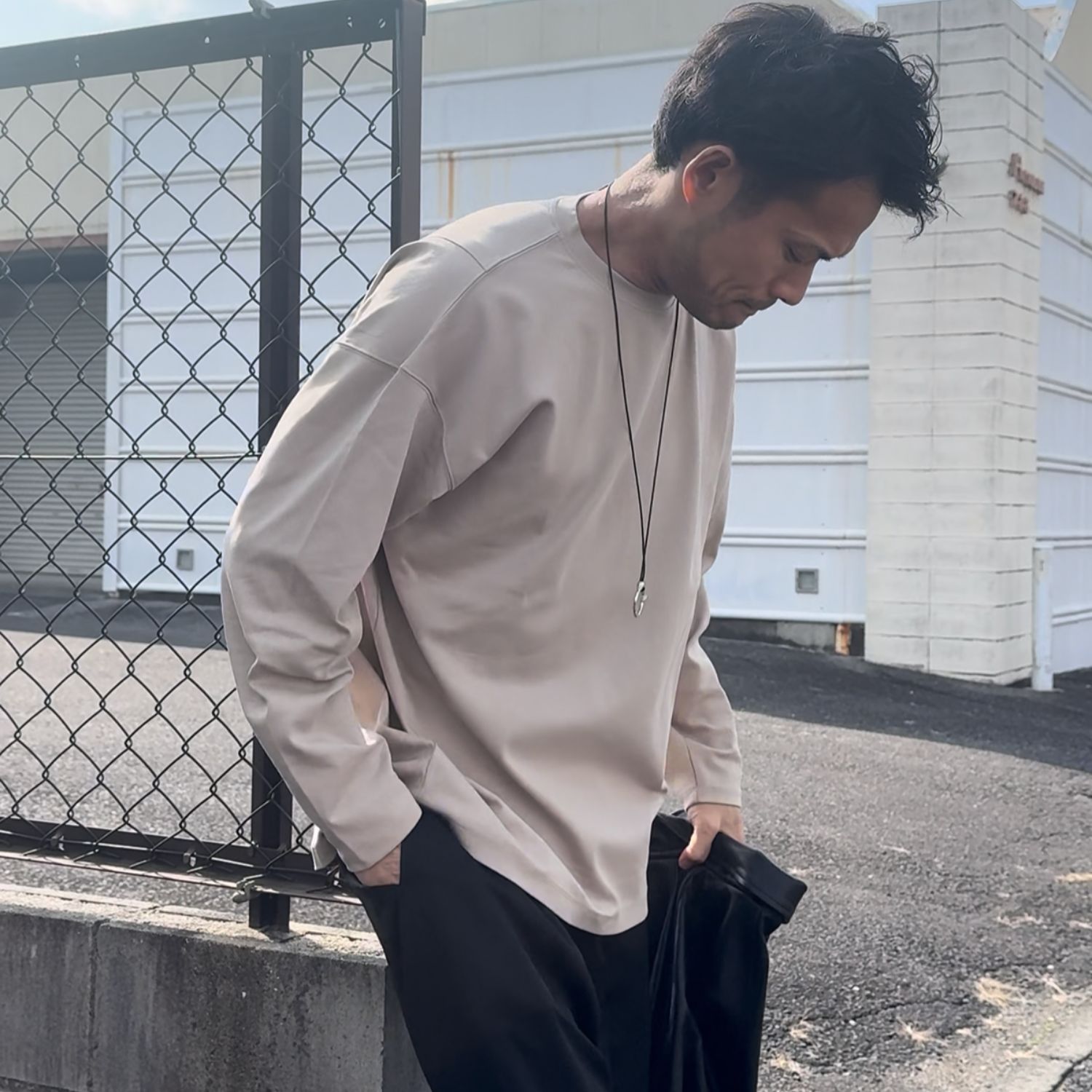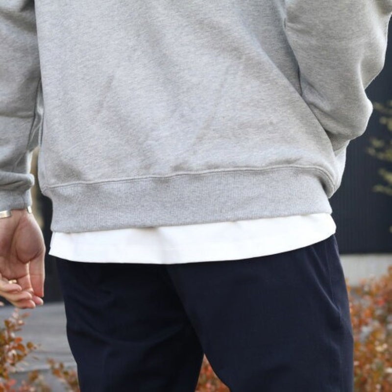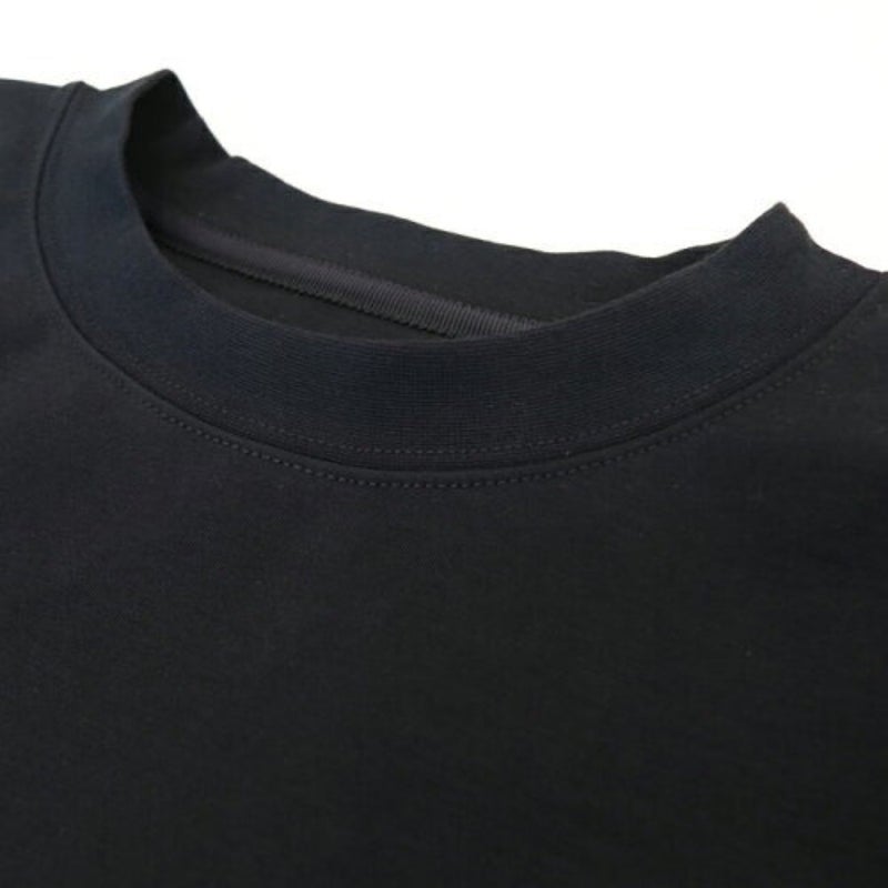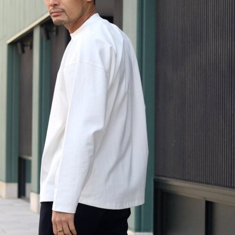 ドロップショルダーのややユルいシルエットながら、身幅を抑えて上からアウターを重ね着しやすいシルエットに仕上げています。前後で長さの異なる裾にデザインされ、無地カットソーでありながら「違い」のある一着です。