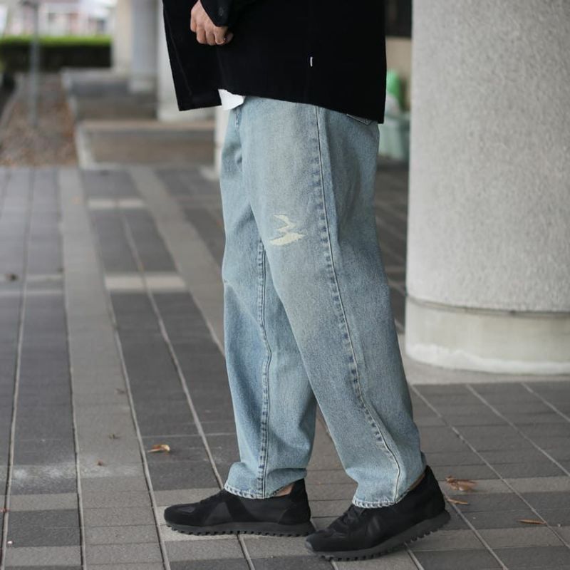 ブリーチカラーにユーズド感のあるデザインが今っぽく、ハーフジップやボアブルゾン、ミリタリーなトップスと好相性です。