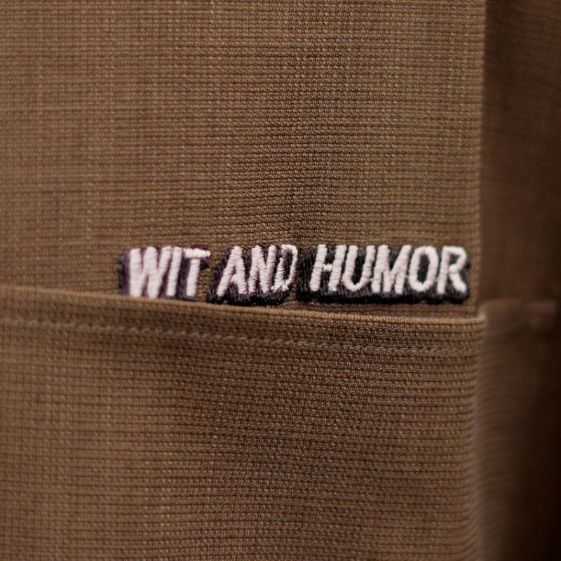 さらに、大きめの胸ポケットには「WIT AND HUMOR」の刺繍がさりげなく隠され、遊び心も忘れません。
