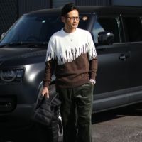 大胆なグラフィックデザインをホワイト×ブラウンの落ち着いたバイカラーで仕上げ、モード感と大人の遊び心を両立した一枚です。