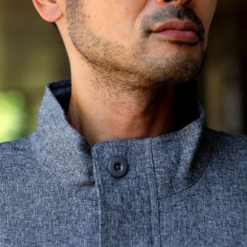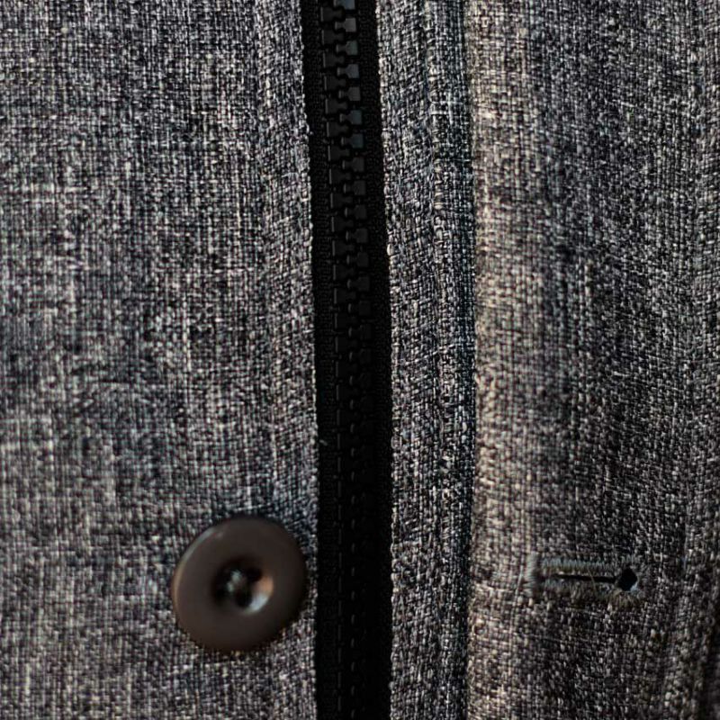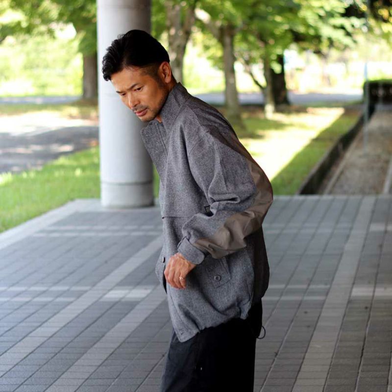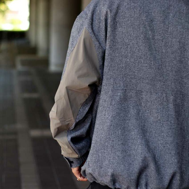 このジャケットは、異なる太さの糸を織り交ぜることで生まれる、独特の凹凸感とナチュラルな表情が特徴のポリエステル生地を使用。