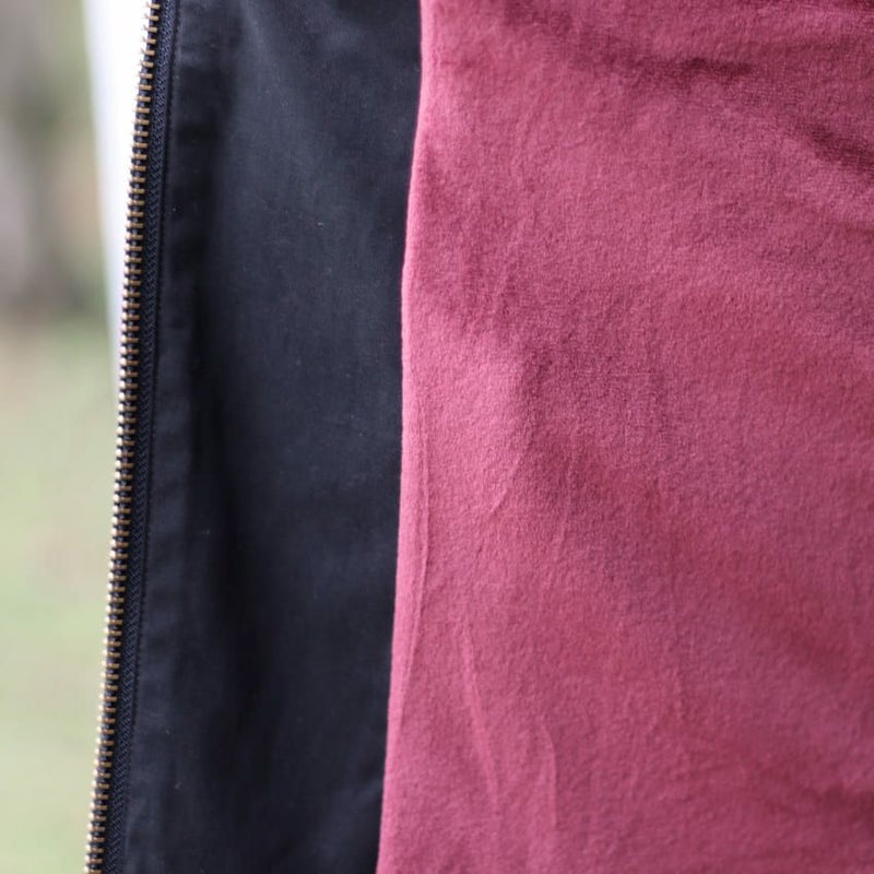 裏地にはワインレッドのマイクロフリースをあしらい、配色に仕上げているだけでなく、防寒性も高めています。