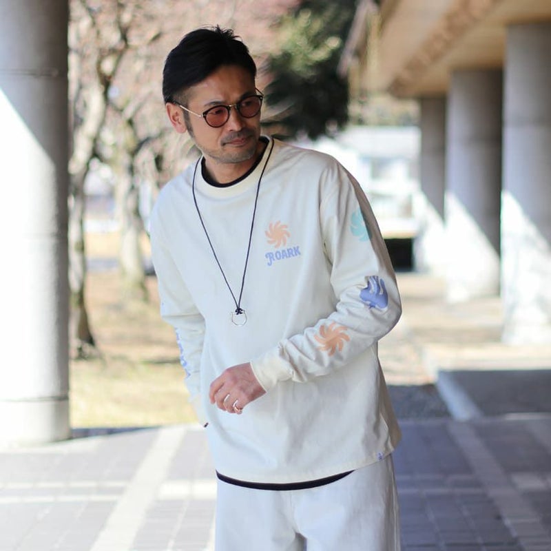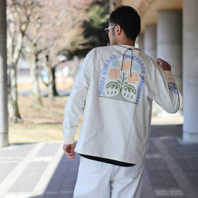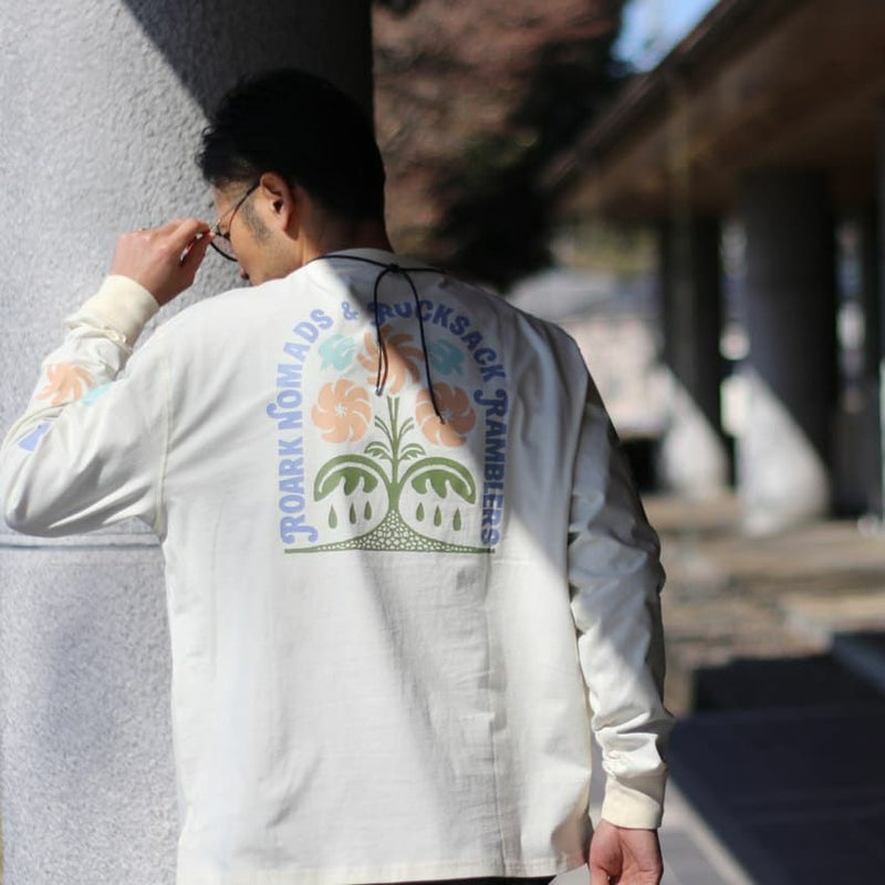 右の袖にはロゴを、左の袖には、鳥やフラワープリントをあしらったユニークなデザイン。