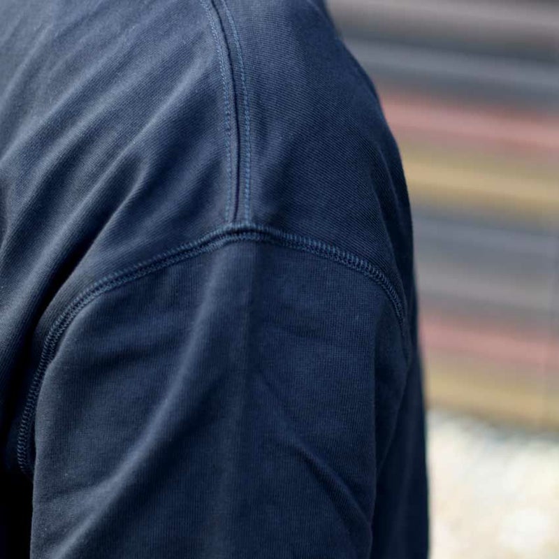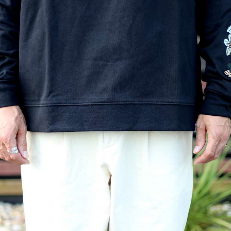 Tシャツ以上、トレーナー未満の絶妙な厚みで、一枚で着てもサマになる仕上がりです。