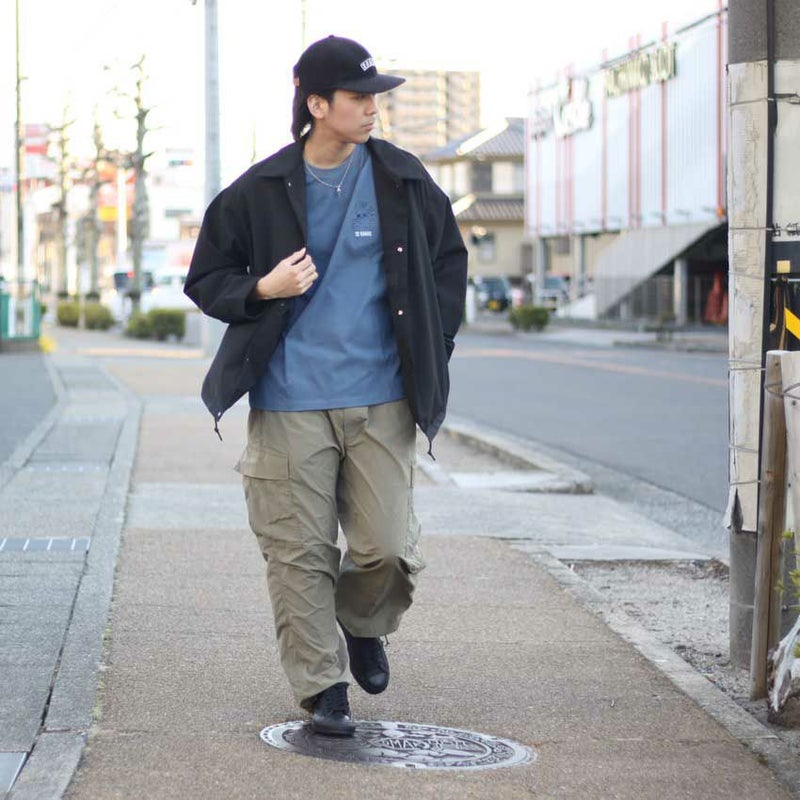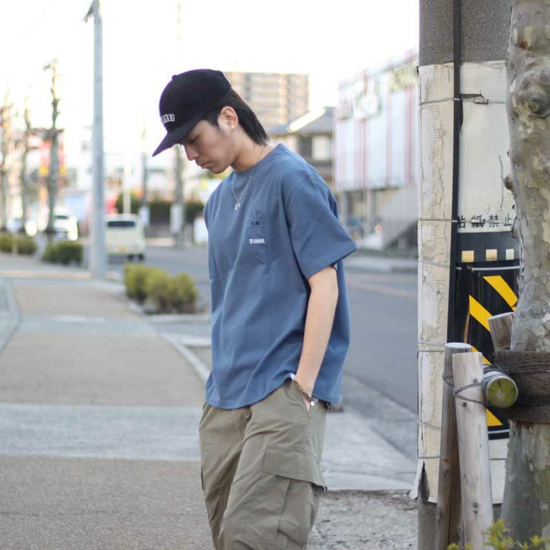 カーゴパンツやデニムなど、あえて王道の合わせ方でも十二分にカッコいいTシャツです。