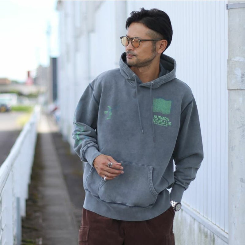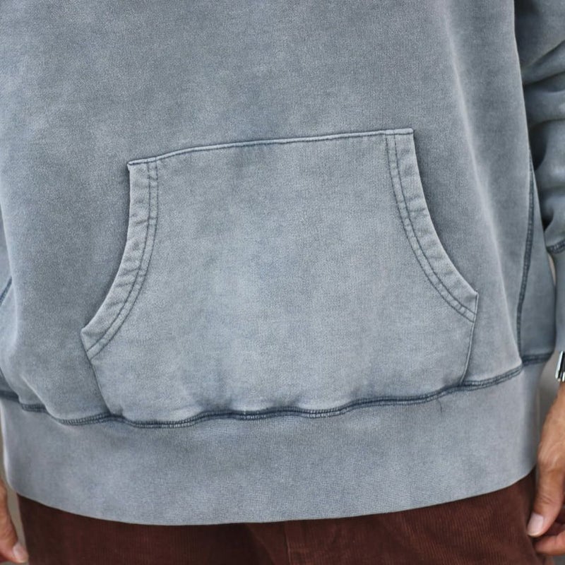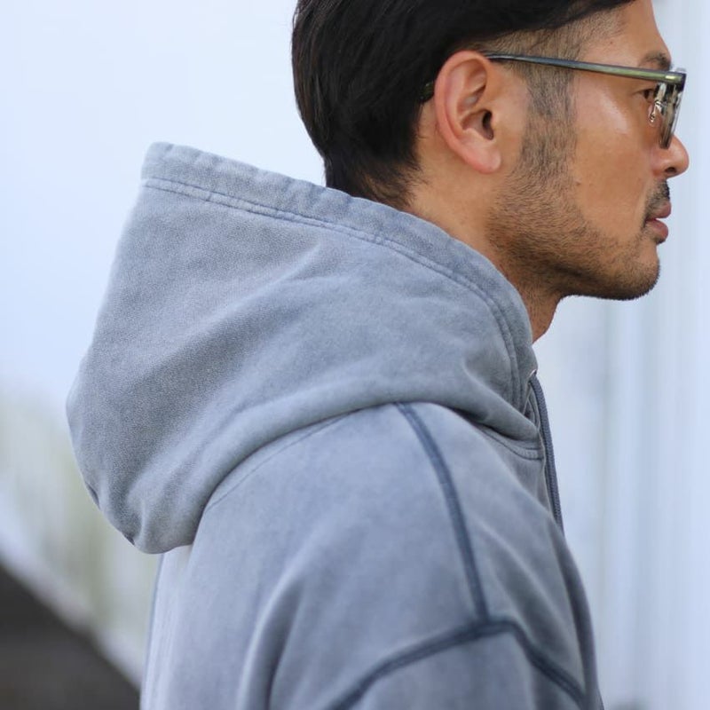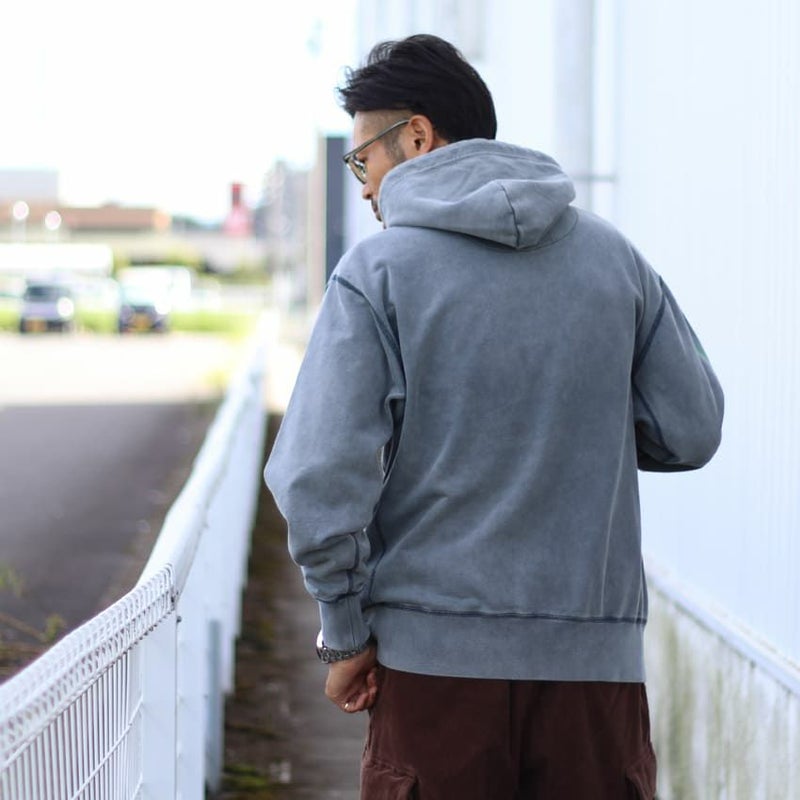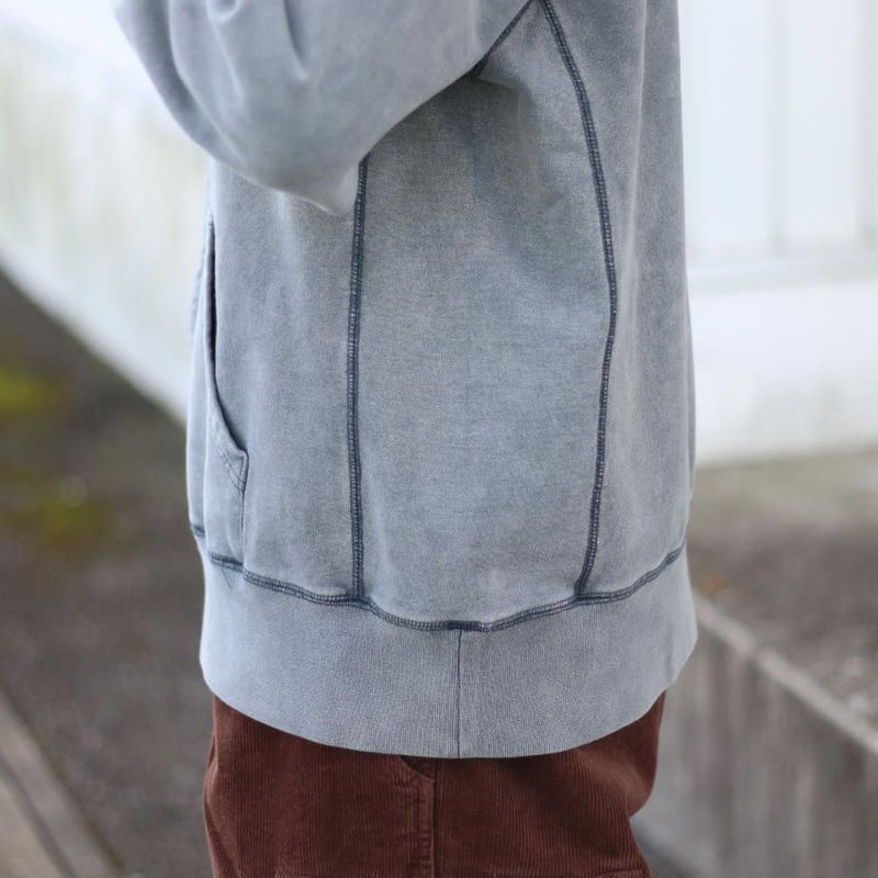 ウォッシュ加工を施し、古着のような風合いに仕上げたプルオーバーパーカー。