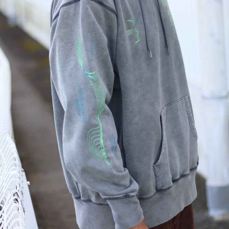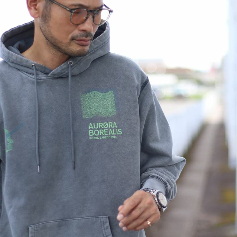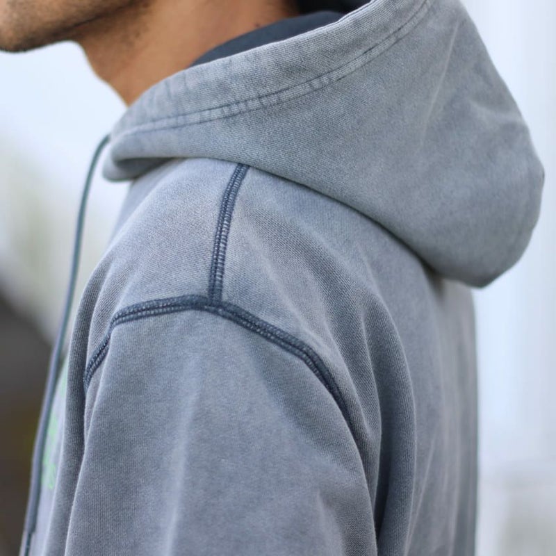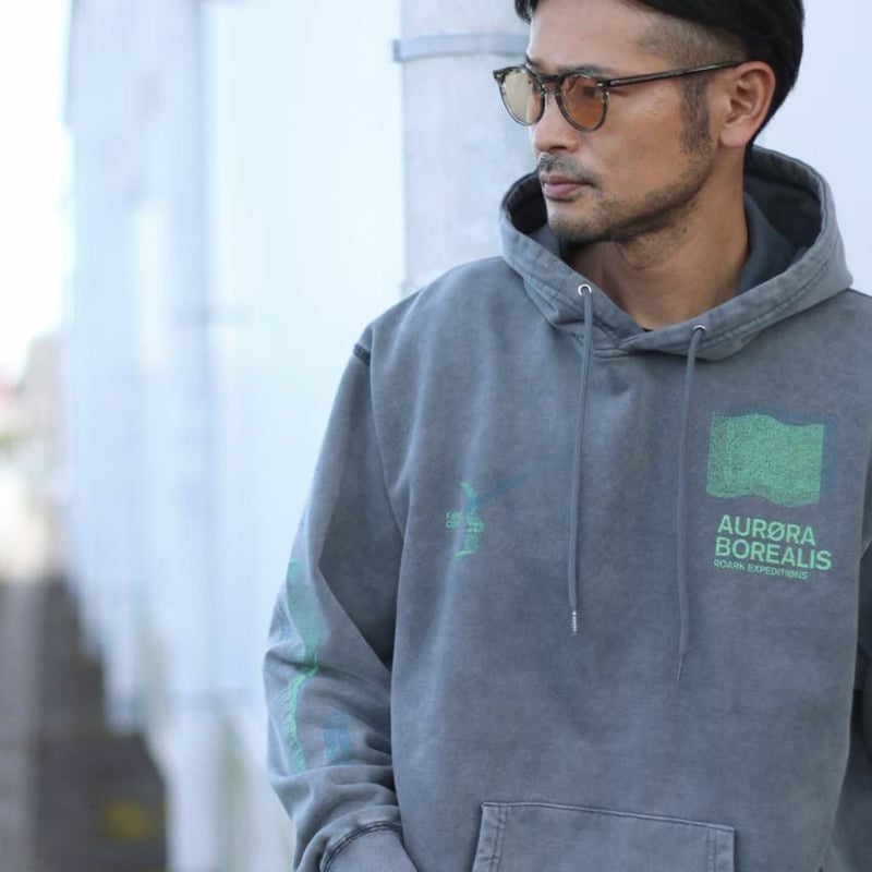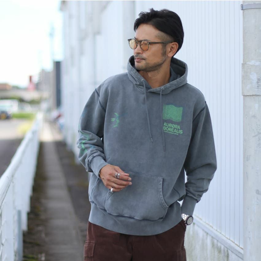 ウォッシュ加工を施し、古着のような風合いに仕上げたプルオーバーパーカー。