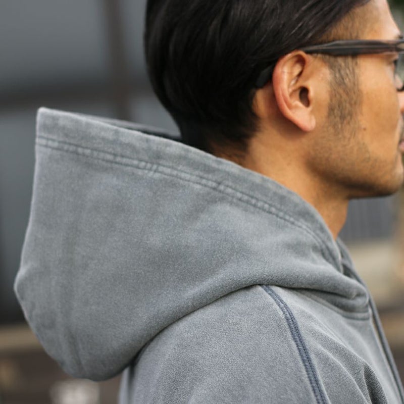 袖口のリブやしっかりと立ち上がるフード、繰り返し洗濯をしても型崩れしないタフな生地は長く着れる安心があります。