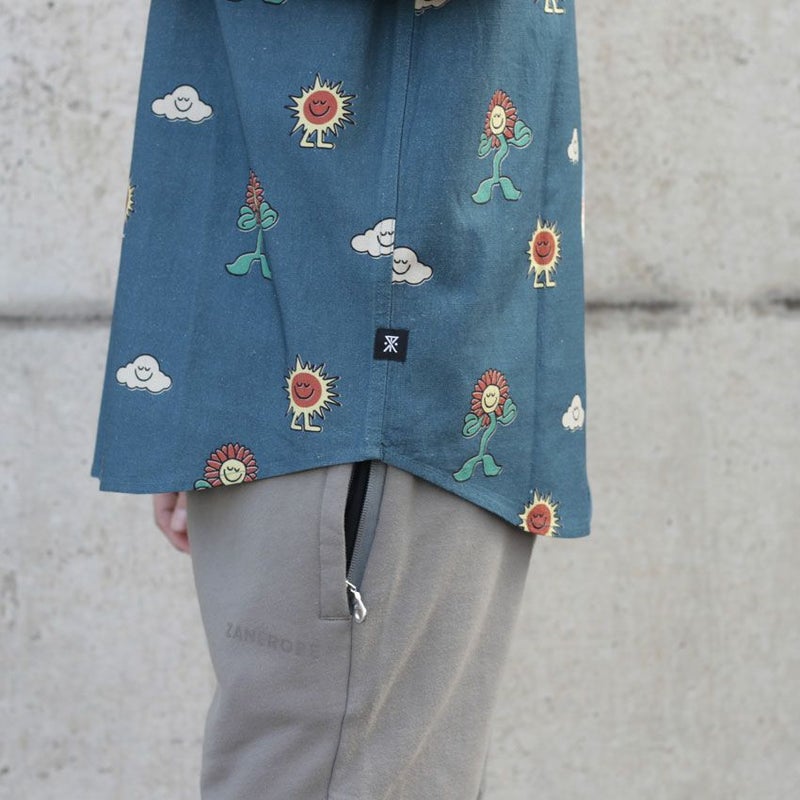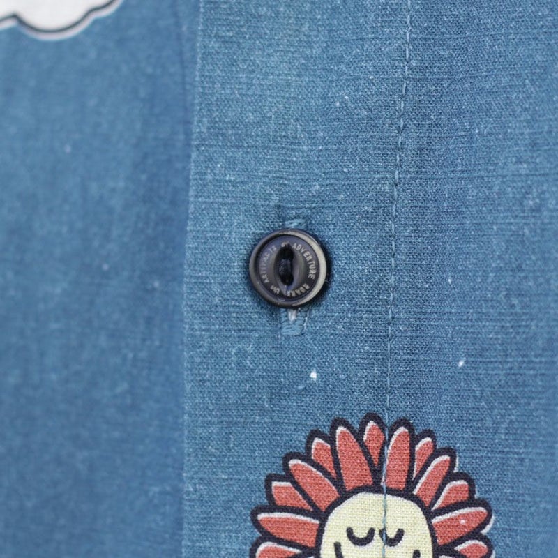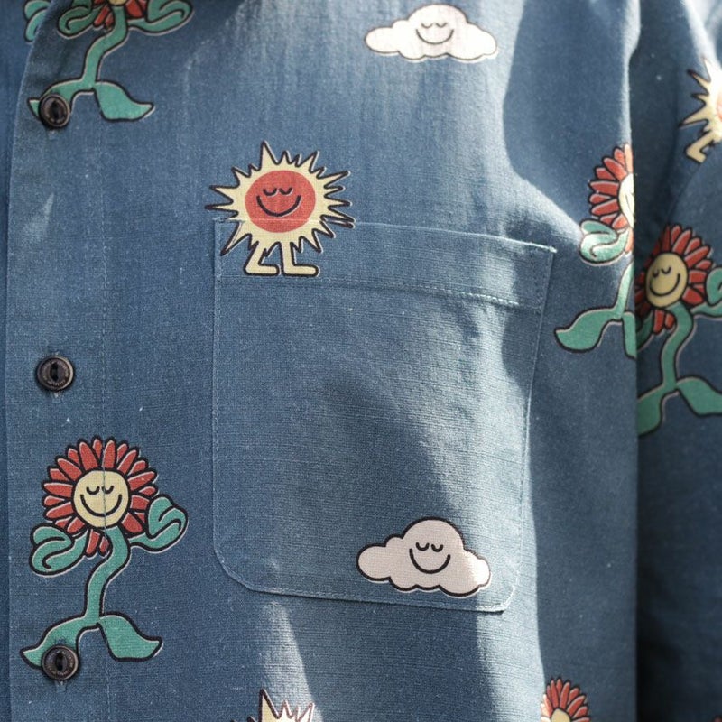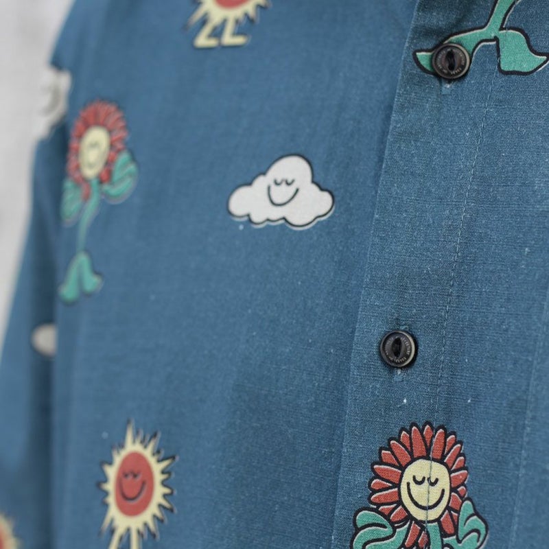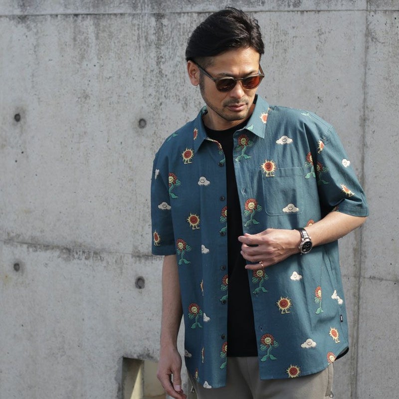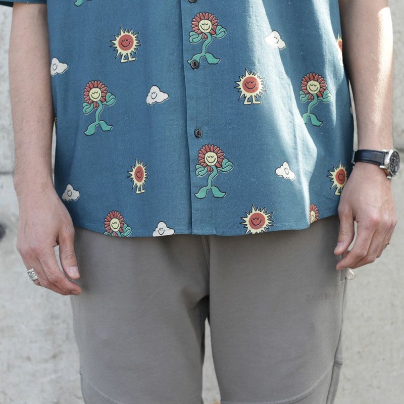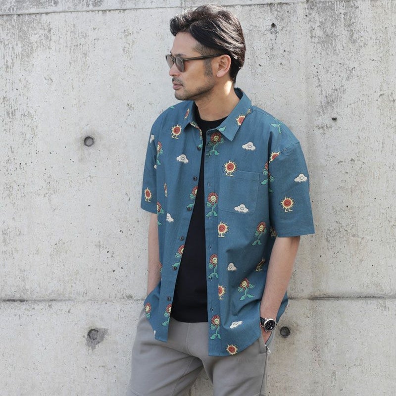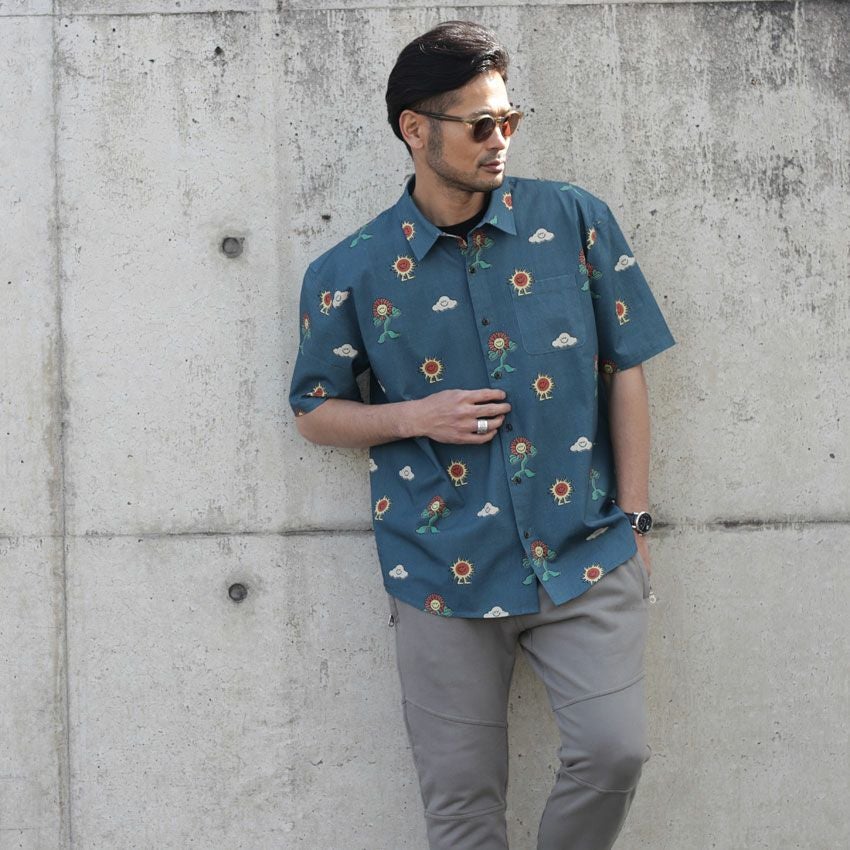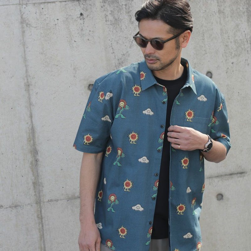 イタリア・サルディーニャ島の太陽をモチーフにした陽気なデザインが特徴の半袖総柄シャツ。