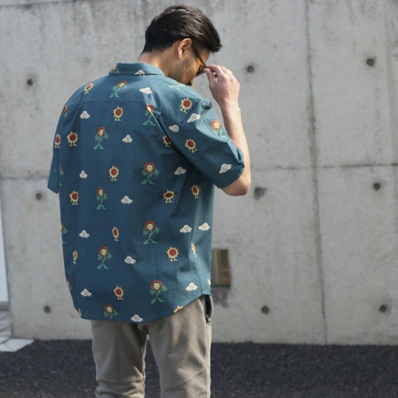 イタリア・サルディーニャ島の太陽をモチーフにした陽気なデザインが特徴の半袖総柄シャツ。