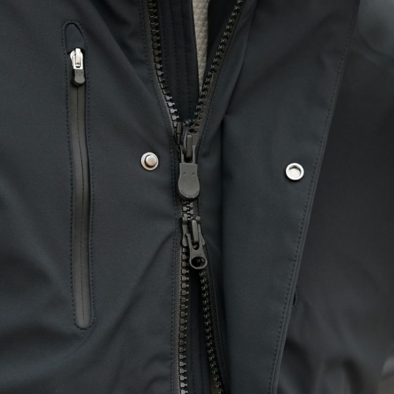 中央はダブルジップになっており上下から開閉できます。 2つの胸ポケットは「耐水性」のジッパーで閉じられ、脇のポケットはインポケットになっており、縫い目が見えないドレス仕様になっております。 左袖のブランドロゴはブラックで高級感が漂います。