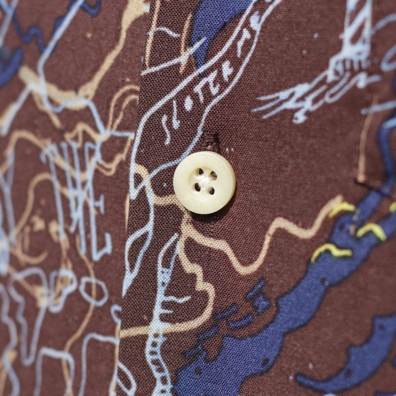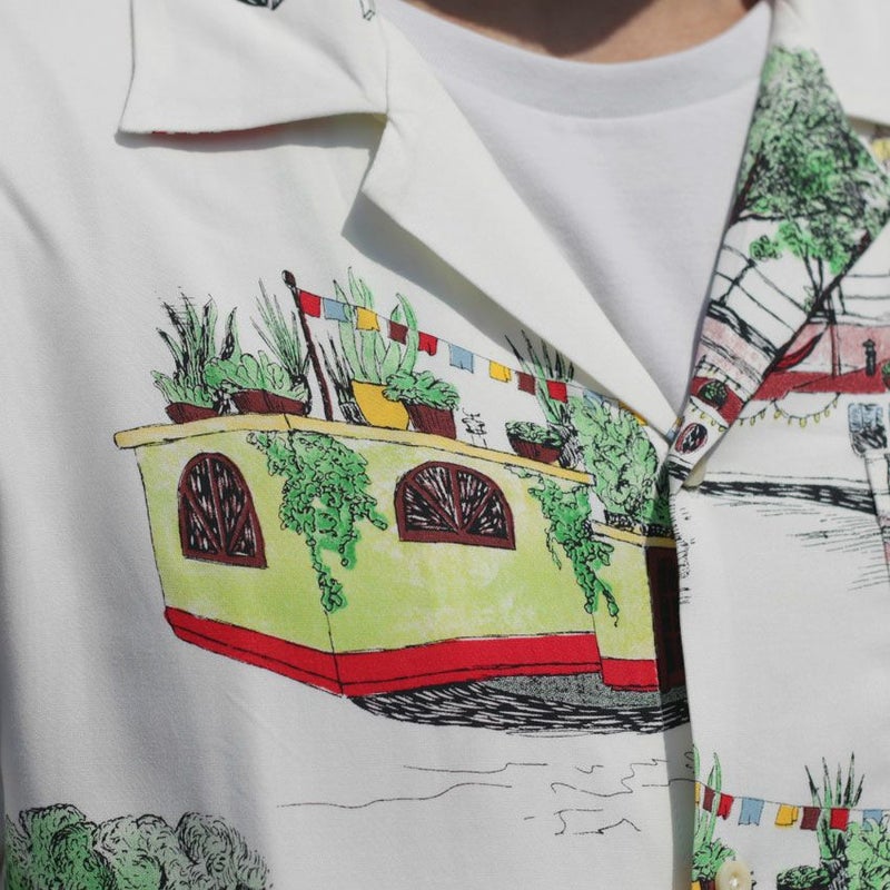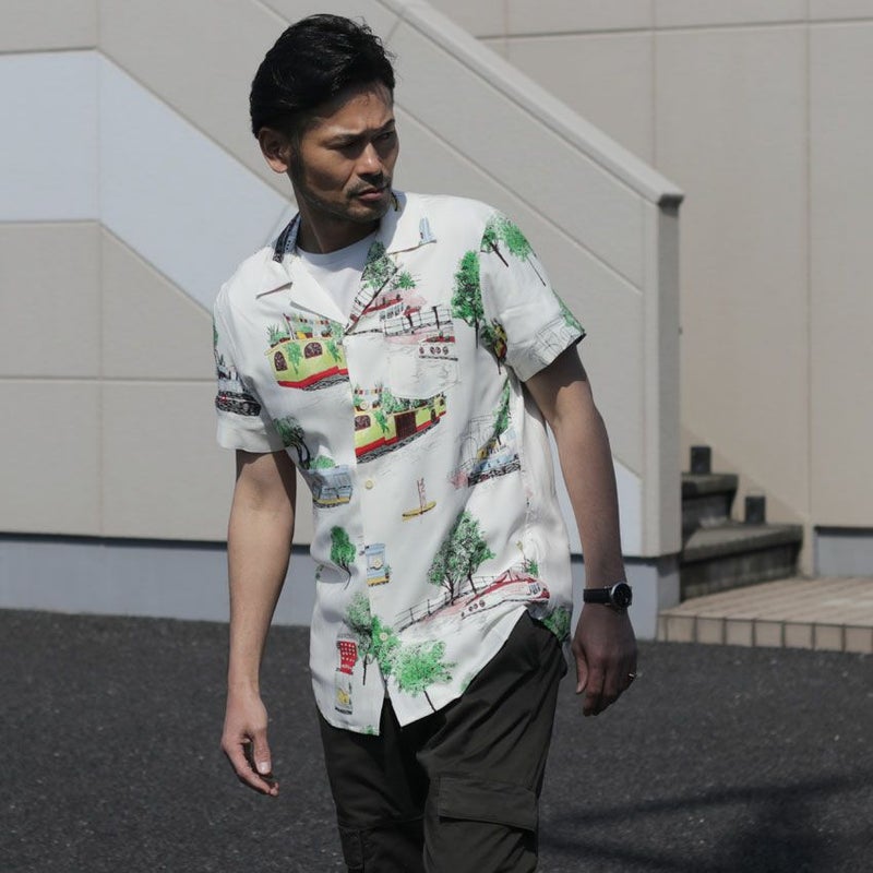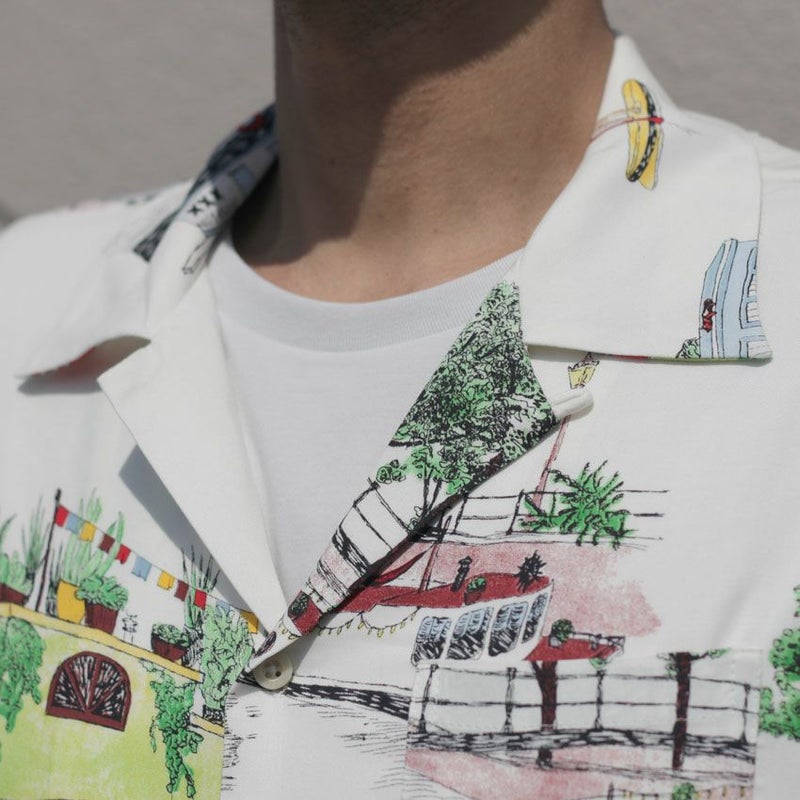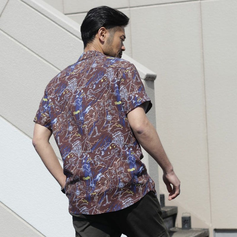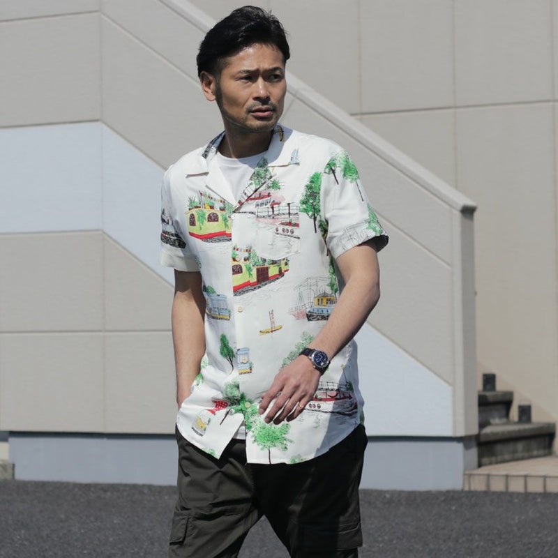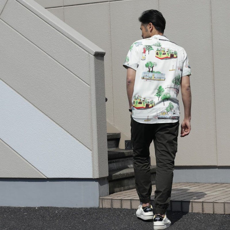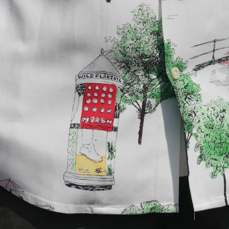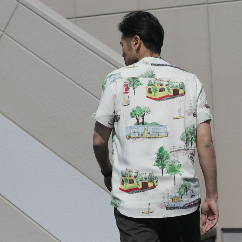 ホワイトベースのシャツには、カラフルな街並みや船の柄をプリントし、ブラウンベースのシャツには、走り書きのような地図や、鉄塔がプリントされています。