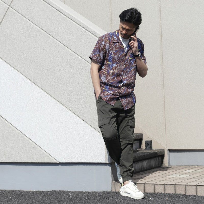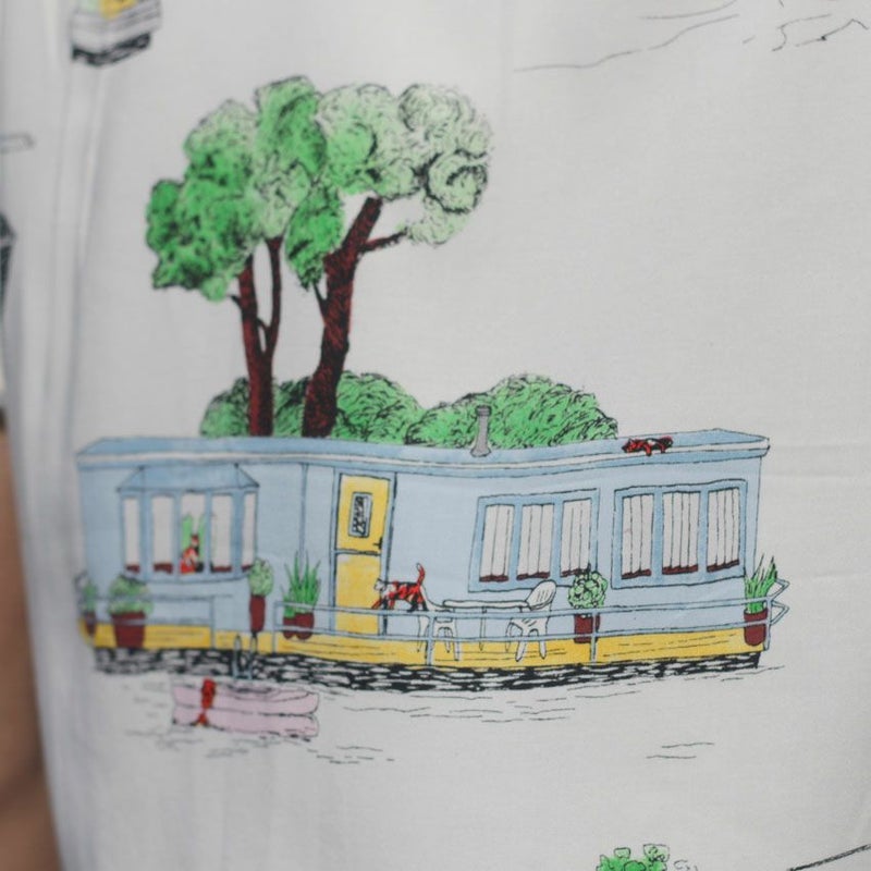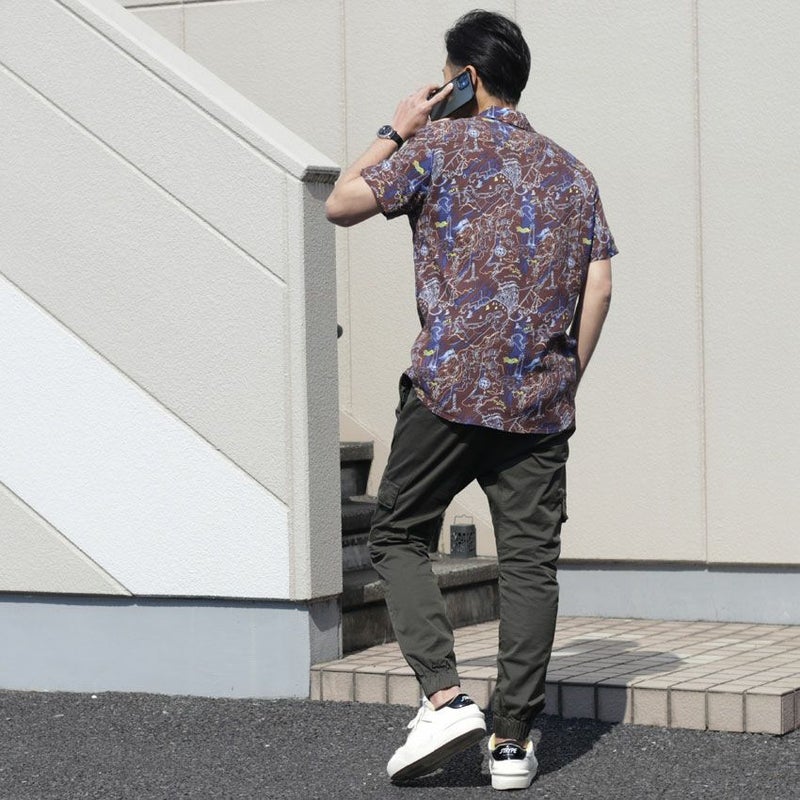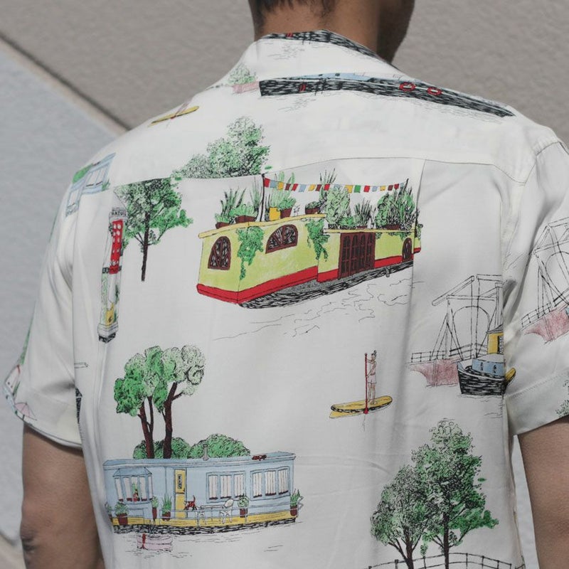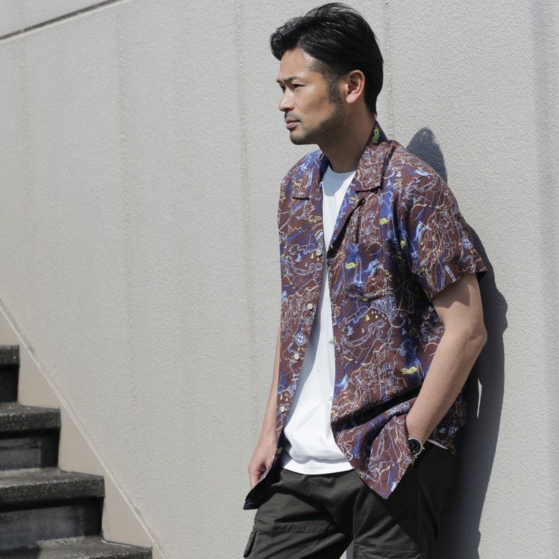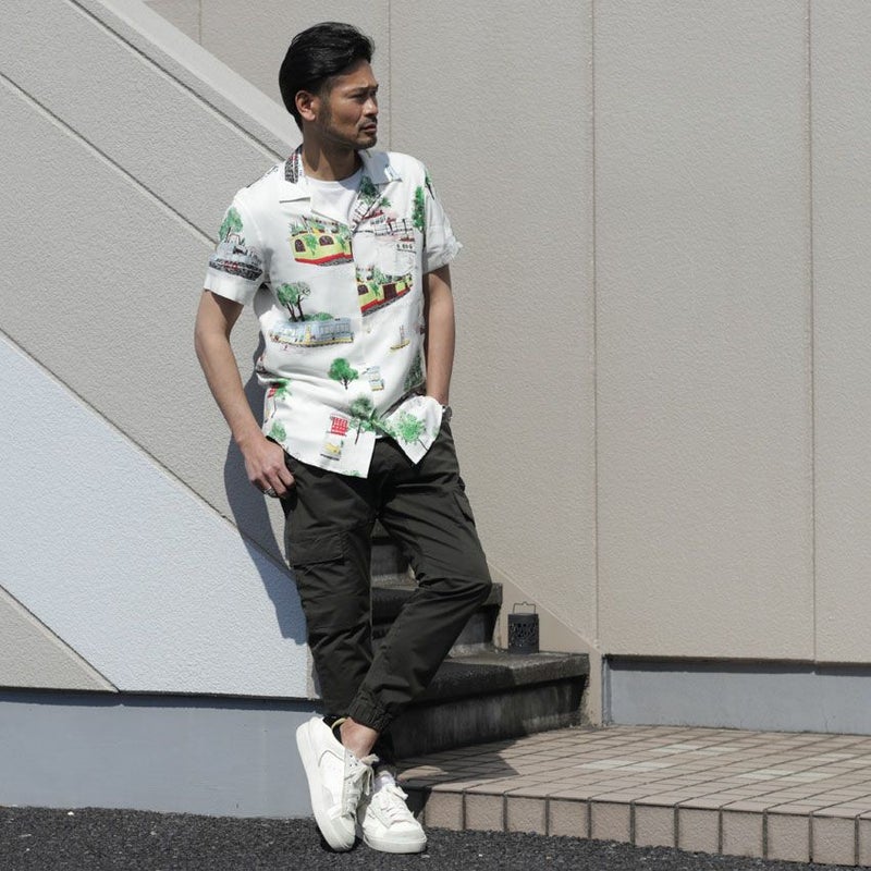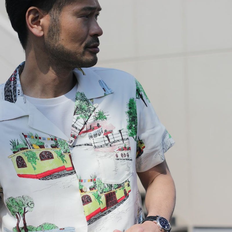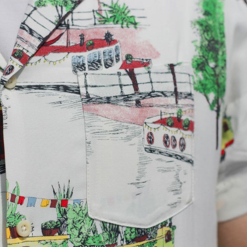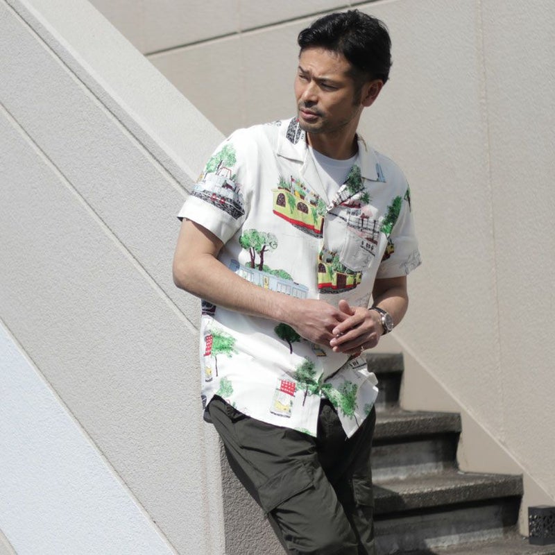 ホワイトベースのシャツには、カラフルな街並みや船の柄をプリントし、ブラウンベースのシャツには、走り書きのような地図や、鉄塔がプリントされています。