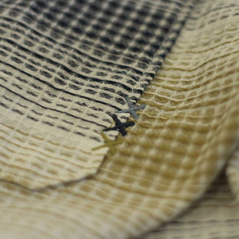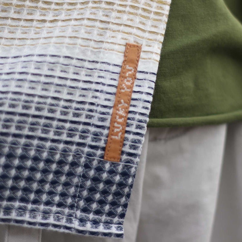 格子状のワッフル織りによる立体感のある生地は、見た目の奥行きだけでなく、通気性にも優れ快適な着心地を実現します。