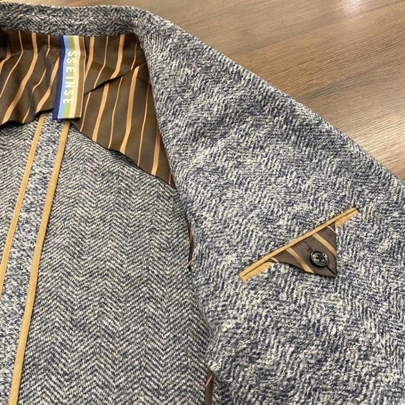 裏地にはオリジナルのサテンストライプの生地を切り替えたり、スウェードのパイピング、ポケットをあしらうことで、インポートブランドらしいギミックの効いたディテールに。
