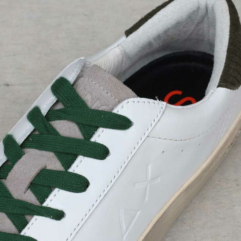 スマートな印象のコートスニーカーをベースに、ダメージ加工を施したソールとダークグリーンの配色がアクセント。