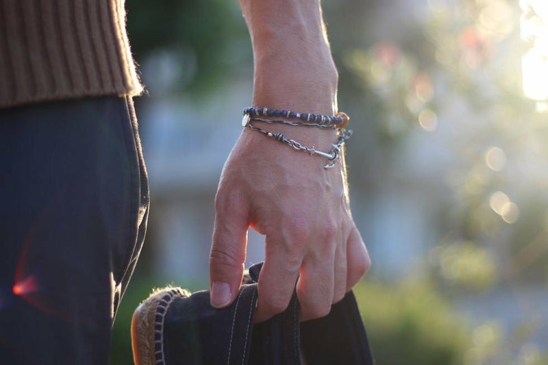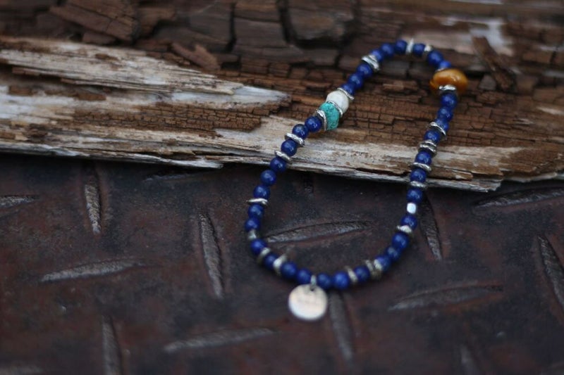 ラピスラズリをメインにタイガーアイ、リバーストーン、ターコイズ、真鍮ビーズをミックスし組み上げたブレスレット