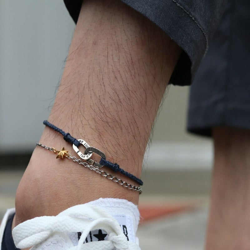 刻印の入ったシルバー製のパズルチェーンと反対側にキュービックジルコニアが中心に入ったゴールドスターを配置した手の込んだアンクレットです