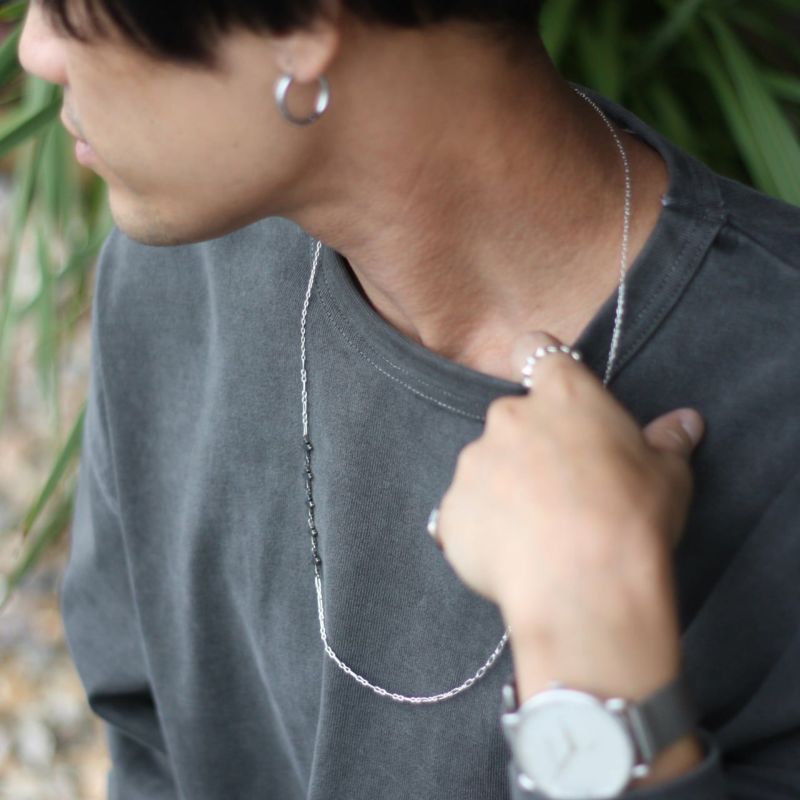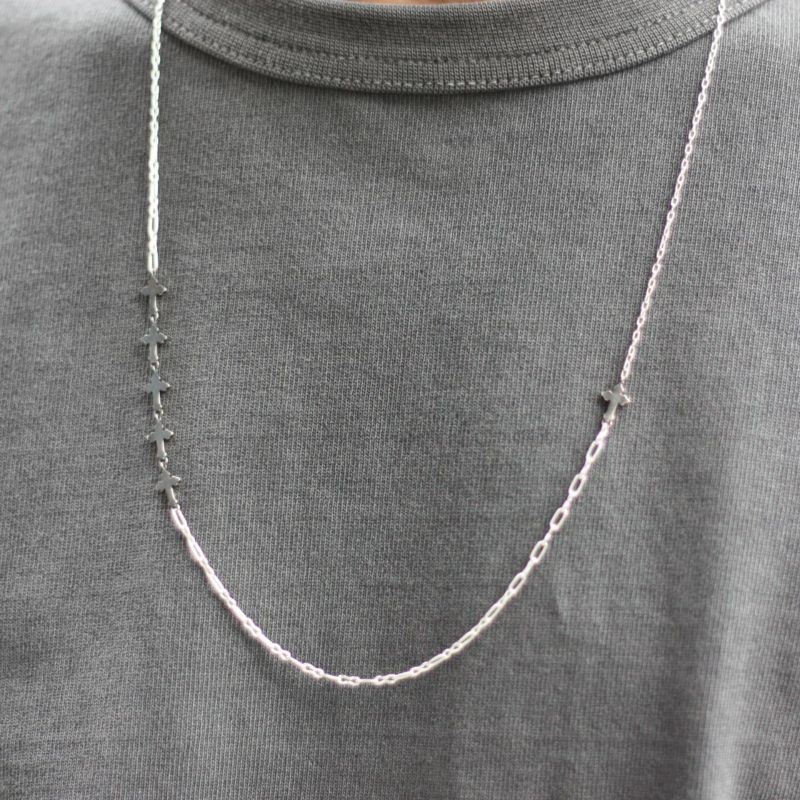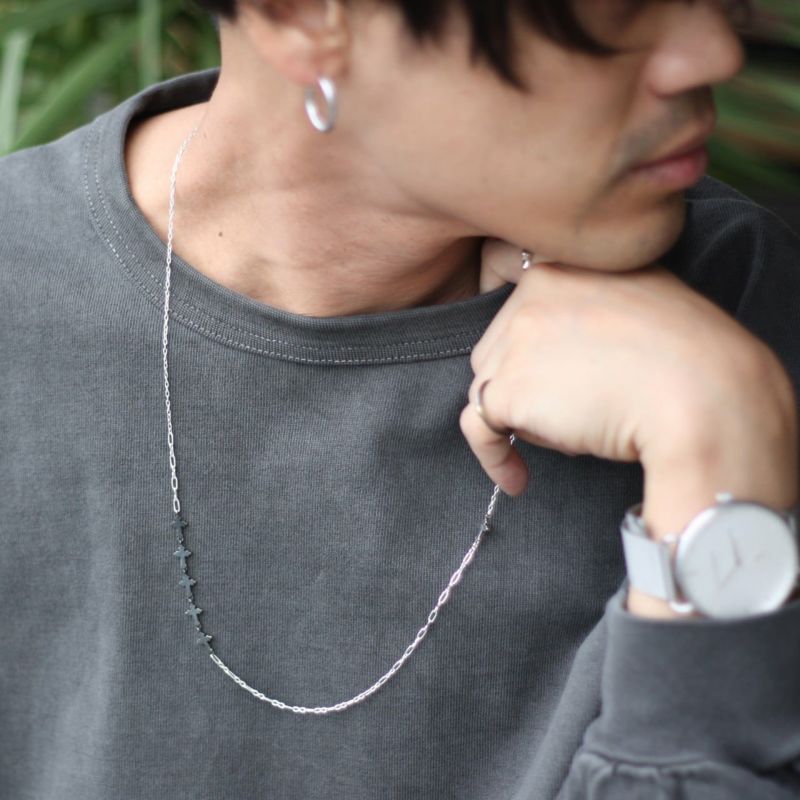 様々なスタイルの燻しが施されたチェーンや磨かれたチェーンに、小さなクロスが施されたクレージーロングチェーンネックレスです