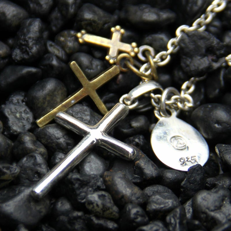 amp japanよりシンプルなシルバークロスのパーツにアンプチャーム、真鍮のクロスチャームがバランス良く組み合わさったネックレスが入荷しました